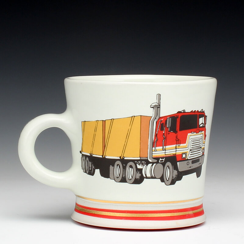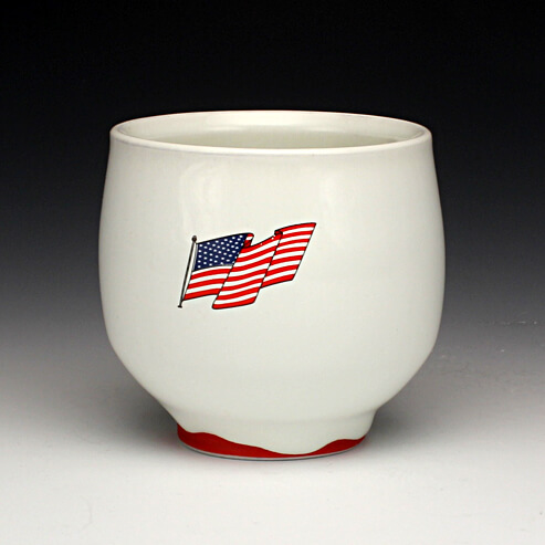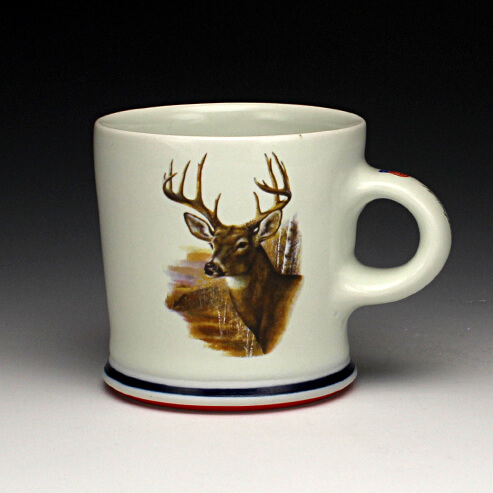 Jr. densely saturates his traditional porcelain functional wares with popular imagery rooted in blue collar Americana. His thrown bowls, jars, mustache cups, and jugs are covered with found decals like old cars with bumper stickers, combining glitzy and tacky for kicks and to jest at common perceptions of the relationship between art and kitsch. He is influenced by late night bar-room scenes with his band, the stoic trucker and his peepshow girlies, Elvis, God, Guns, Beer, and other classics like Cars and Beer. In particular this body of work depicts “Western” wildlife and other things Alaskan. He brazenly brands his pots with his name and iconic logos like “Harley Davidson” to exploit the issue of the artist’s ego and explore the distinction between commercialized commodity and the conceptual fine object.
