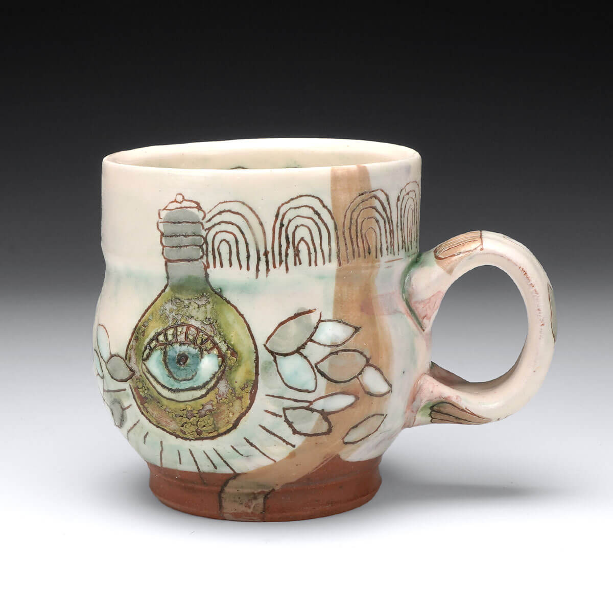 The high contrast, graphic images are created on a thermofax machine, and are positioned next to incised hand drawn lines and loose, ephemeral washes of color. I yearn to process my experience as a human in the world adjacent to both urban and natural landscapes through the simple balance of the loose blooms of underglaze drips with the tight, sharp line quality carved into the clay.