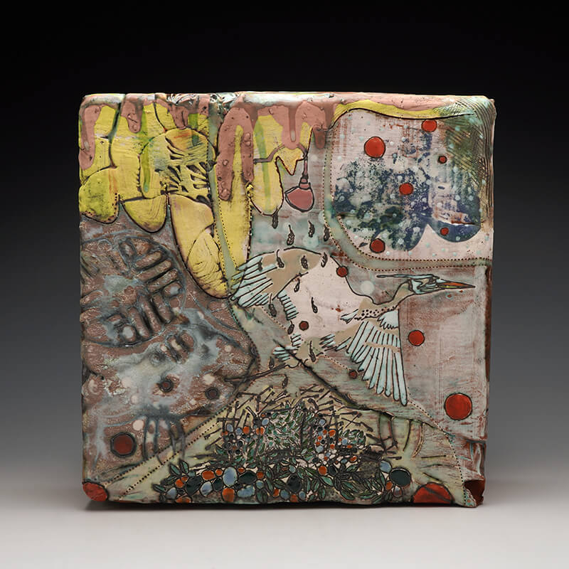 I consider the earthenware wall pieces and vessels act as artifacts, recalling a time past, while the permanence of each fired object reveals the very substance of the Earth – clay itself. Topics in my work such as the Anthropocene call attention to technology, culture and sustainability, while more personal focus on trauma in human relationships and the fragility of memory suggest surreal compositions blending math formulas and other symbols with objects from nature. The viewer is asked to enter each clay canvas; to be curious of what is temporary, beautiful, and build their own story.