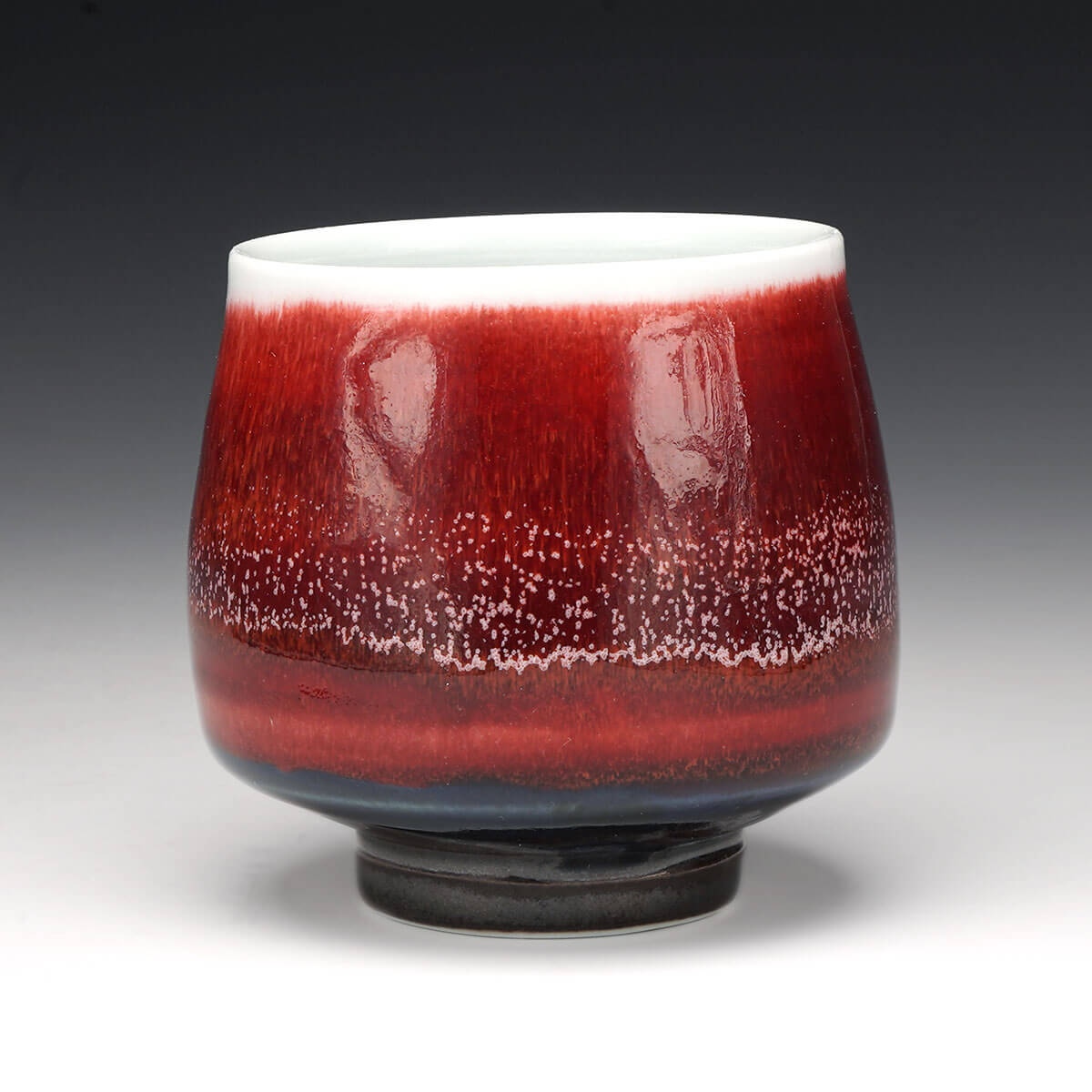 I also have a passion for glazes. They enhance the movement of my work with luminous flowing crystal surfaces and embellish the pots with rich glaze depth and color. Layering of glazes promotes the microcrystalline effects. I have formulated copper red variations with delicate white crystals for cups and vessels, brilliant celadon on white glazes (the Dancing Teapot) and other fascinating microcrystalline effects that are not represented in the limited images.
