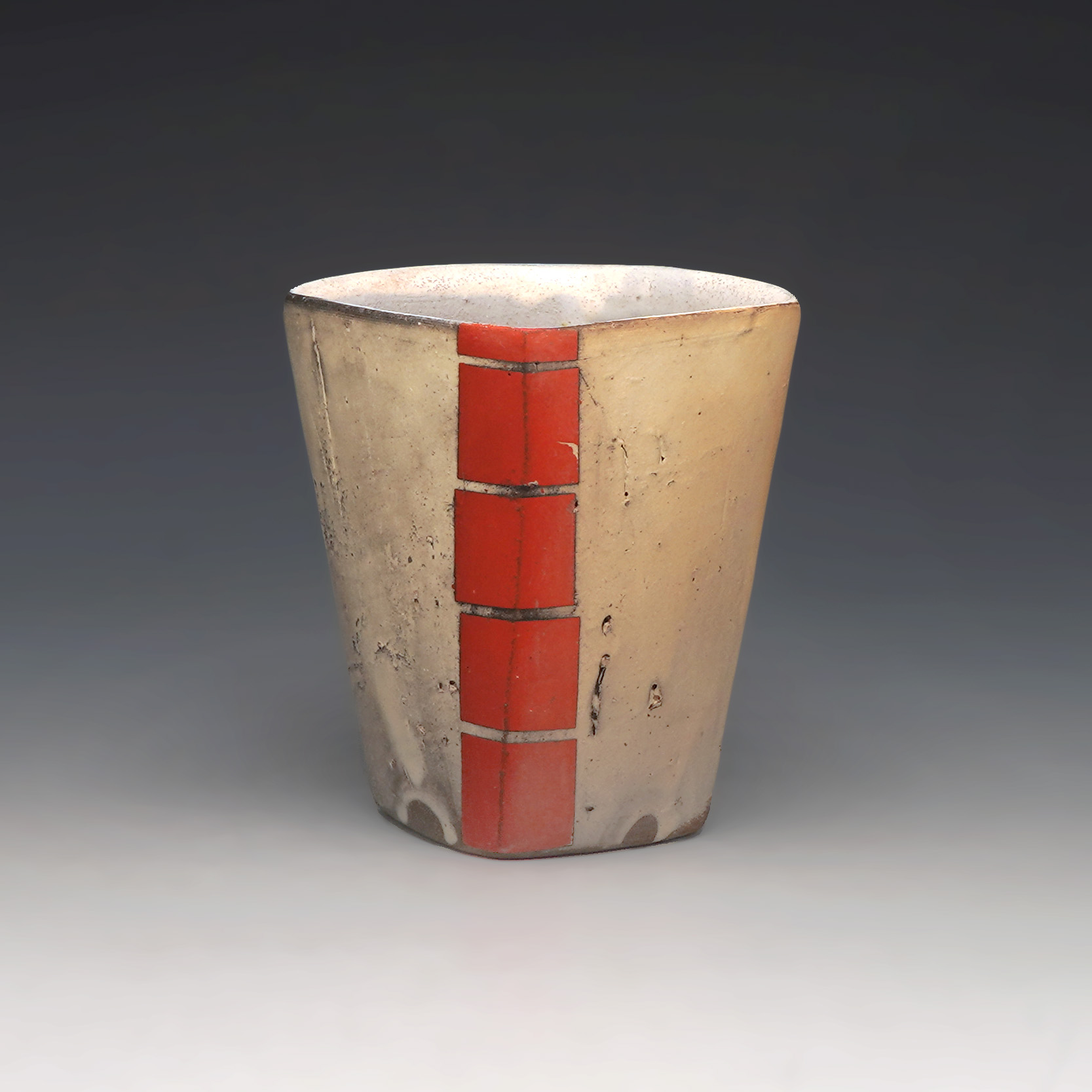 I seek a balance between tradition and modern. My pots have layers, first the decoration that is bright yet flat and in the foreground. My decoration is minimal or often a simple graphic, placement of this moment is essential to the focal point of each pot. Second the slip that is fluid and has a rich depth in surface. Finally, the ruggedness of the clay with scrapes and small pits. This cumulative journey of a pot tells a story. This story brings the user into the moment of making and firing. Slips, trimming lines, finger marks, edges, wad marks, drips, scratches and shadows capture a moment in time and tell more of the story. I react to every firing with new ideas and new information; this keeps the overall process fresh and exciting. A successful pot has depth through these processes, obtains humbleness through form and both a thoughtfulness and playfulness in function.