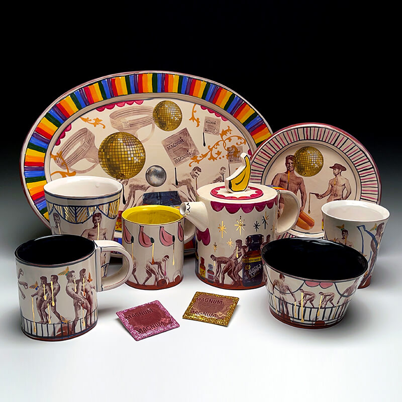 My current body of artwork examines different facets of gay male sexuality and homoeroticism through the lens of queer theory using appropriation of imagery and objects. My artwork is provocative, sexual, deviant at times, and incorporates both nude and naked men draped and dripping in gold. I want to address and question what it means to be gay, queer, and cisgender not only for my own sexuality, but for those around me too, both stranger and acquaintance. I want to examine not only the normative behavior but also the deviant lifestyle, past and present, that often gets neglected and chastised. The AIDS pandemic has become a major focus in my studio practice as this is history in the Queer realm that cannot be forgotten. AIDS IS STILL HERE. With previous artwork, I was examining my surroundings and personal encounters as the influence for the start of the collage process. Recently, I have put myself aside as the starting point and have begun looking at other encounters and relationships in a voyeuristic way, using personal ads posted on dating/sex websites and mobile dating/sex applications. In this online and instant world, I can find both the normative and the deviant behaviors that interest me to create the narratives that often begin as works on paper and transition to ceramics, ranging from functional artwork to vessels and sculpture.