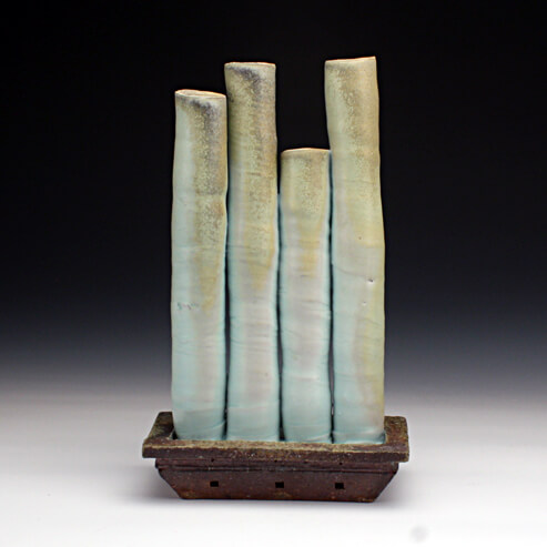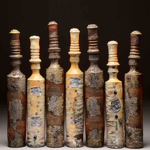 A desire to have objects that fulfill specific purposes inspires me to make functional pots. The infinite and elusive variety of texture and color attainable through the various making and firing processes that I use has generated an interest in presentation. I enjoy presenting my work so that a viewer might notice and appreciate subtle differences in form and surface. By grouping similar forms of differing size and color I hope to compose a visually dynamic display, which invites the viewer to enjoy the tactile nature of each individual piece and how they relate to one another.