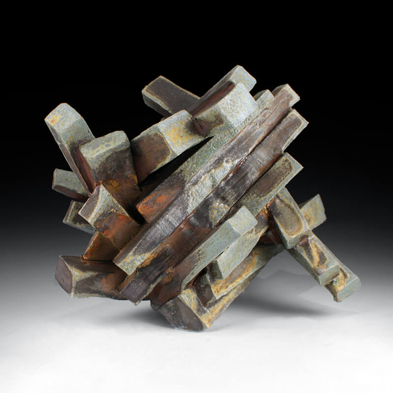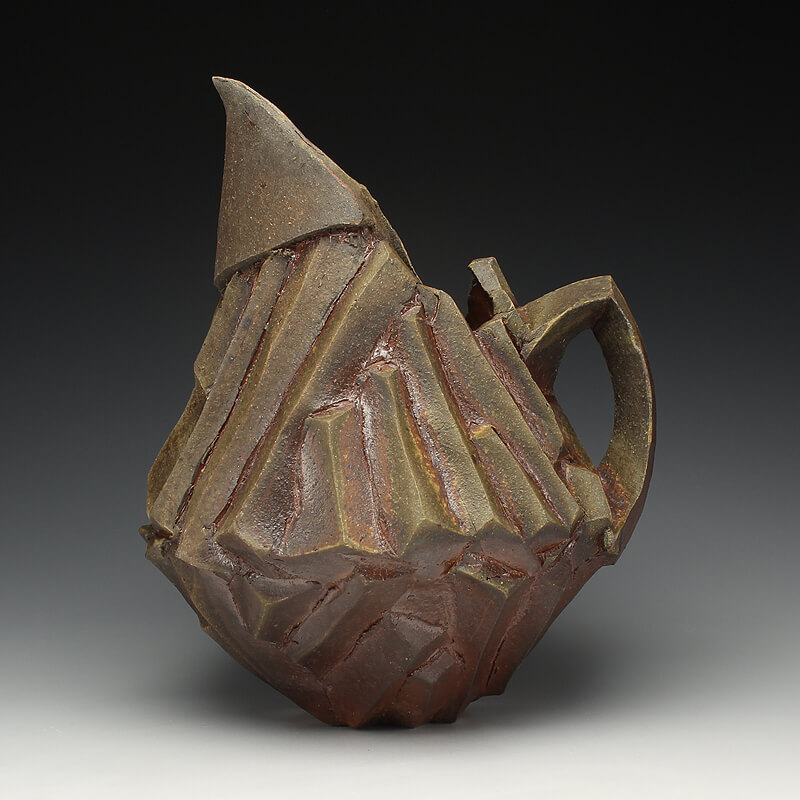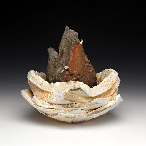 Creating ceramic vessels that share aspects of the geologic world and domestic space fascinates me. Smooth volumes, stressed surfaces, thick slashes, jagged edges and ripped segments of a vessel act as abstracted conduits to potent Earth features and physicality while not obliterating vessel space. Compressing rugged forms with volume in this way evokes reactive spatial relationships. Ranges of color and texture built in the volatile atmosphere of a wood kiln extend connections to material diversity reflected in the world. Dynamic additive and subtractive layers of information, developed through forming and firing, reveals constantly shifting perspectives to massive geologic systems.