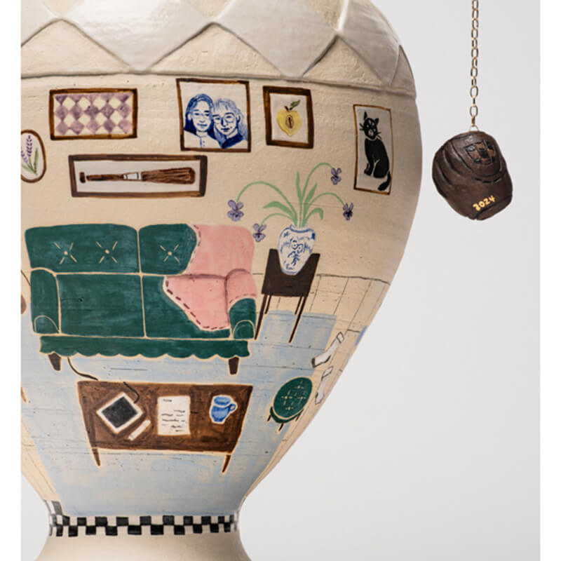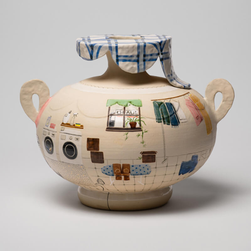 I make work that seeks to encapsulate contemporary queer life. Drawing influence from Greco-Roman forms, my vessels and functional ware work to visualize the quieter moments of queer domesticity. Through layering and multiple firings, I draw and paint scenes that visually represent quiet dinners with my partner, and objects in our living room, as well as sweaters and clothing we share as a part of our entwined closet. I couple these moments with hidden historic and contemporary queer symbols such as violets and lavender flowers, cartons of oat milk, and carabiners as a way to collage the lineage of lesbian culture. My work investigates the relationship between sapphic life and the domestic sphere, focuses attention on the quieter aspects of queer domesticity, and opens a conversation about queer cultural norms.