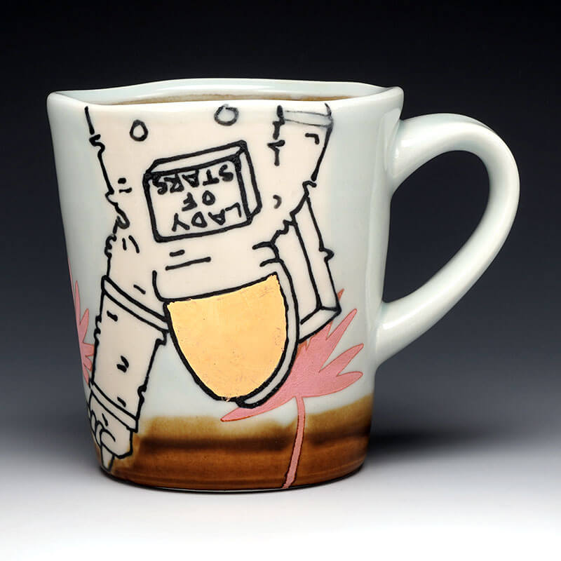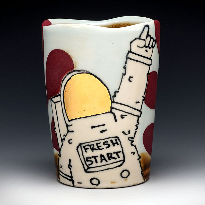 I always get the question, “why astronauts?” – my response is always, “there’s a lot of reasons, but to start, they’re funny…”! I use humor to draw the viewer in. I find the astronaut image speaks to people on different levels; for some, it’s scientific or about exploration, others see a nerdy outsider or a space cadet. People find aspects of themselves in these quirky illustrations and sculptures. I want you to be surprised when you see yourself reflected in the gold luster face shield! I hope that my Astroware pieces uplift, bring a smile to your face, and offer a moment of intimate self-reflection… literally!
