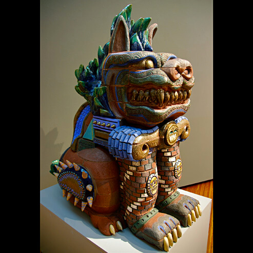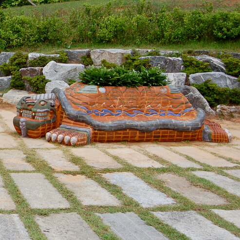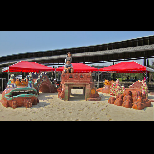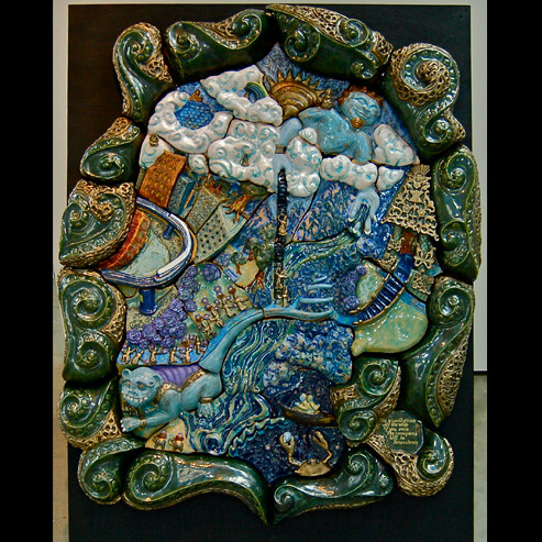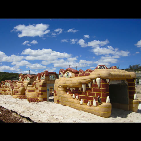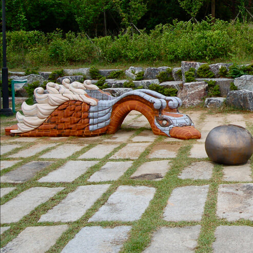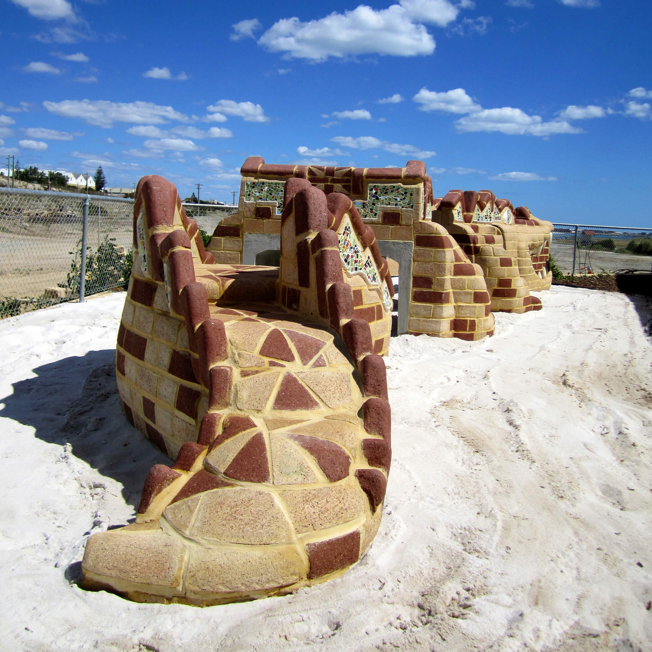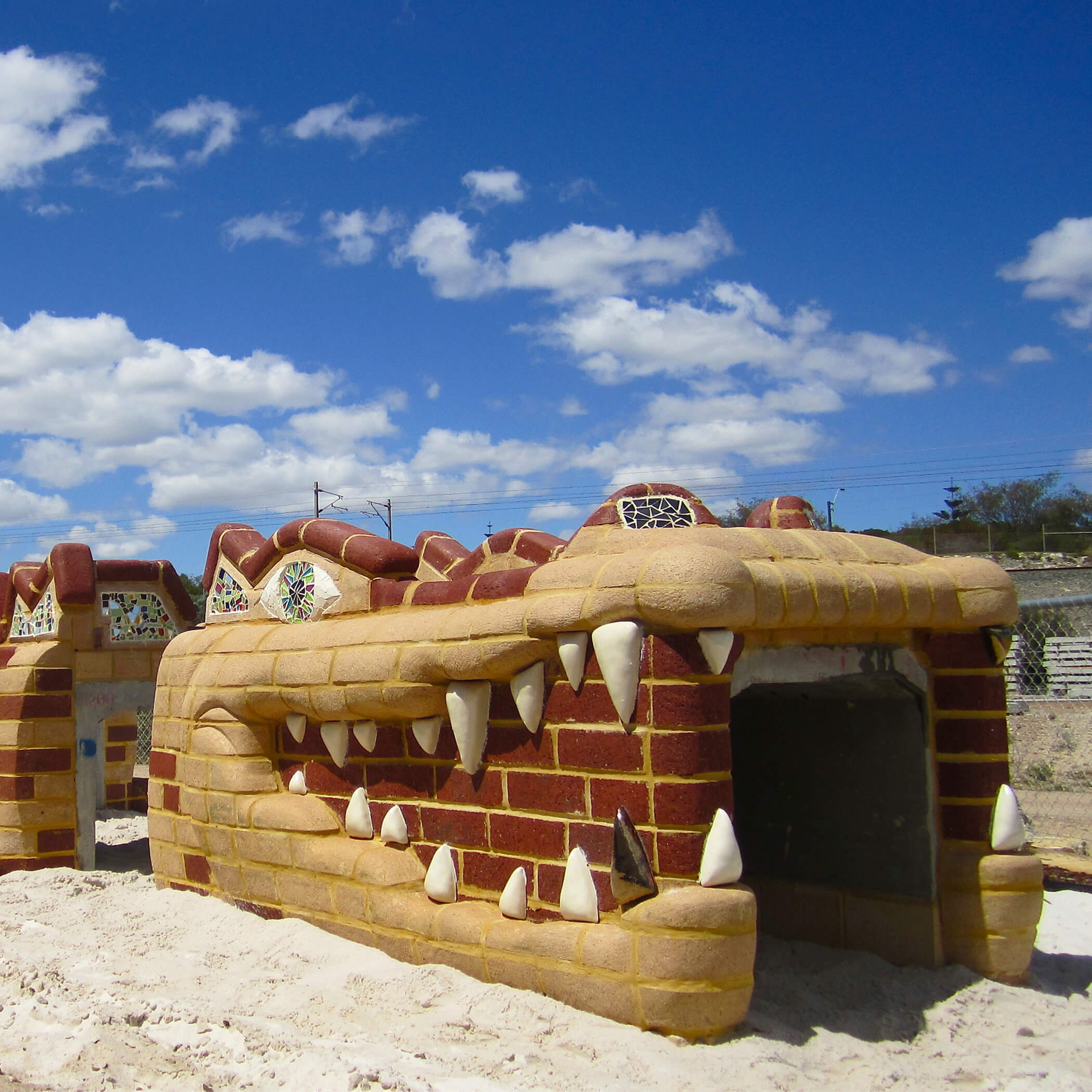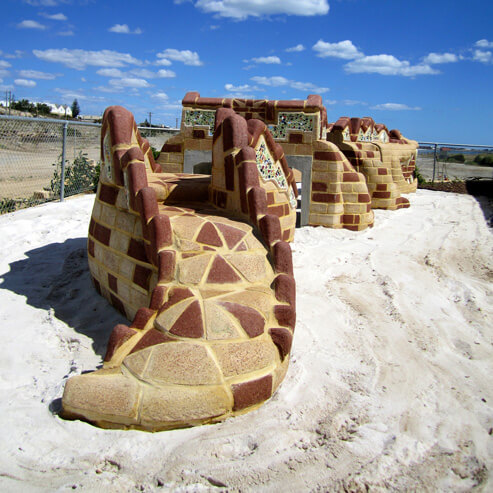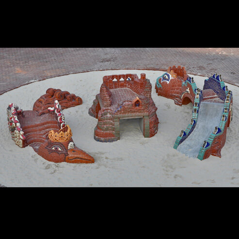 The materials we use are carved brick, high relief sculpted tile, mosaic tile, wood, glass, metal and concrete. These materials allow endless combinations to achieve many colors, textures, and function. The function of our work ranges from monolithic monuments to sculptures that incorporate bench seating, planters, archways, slides, tunnels, and bridges. Our most recent project, “Dragonfly” has climbing rope wings, six benches, dalle de verre windows, and seven polished concrete slides. We push the viewers physical use of our work depending on the appropriateness of the site.