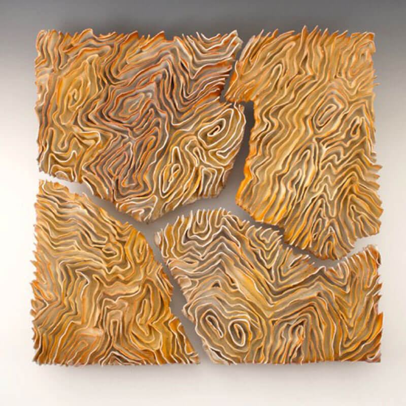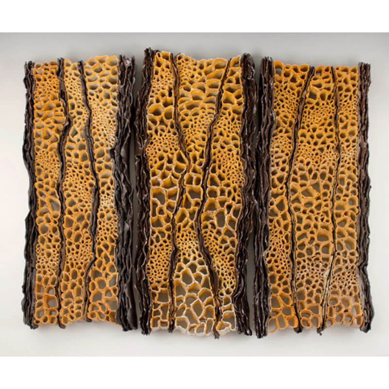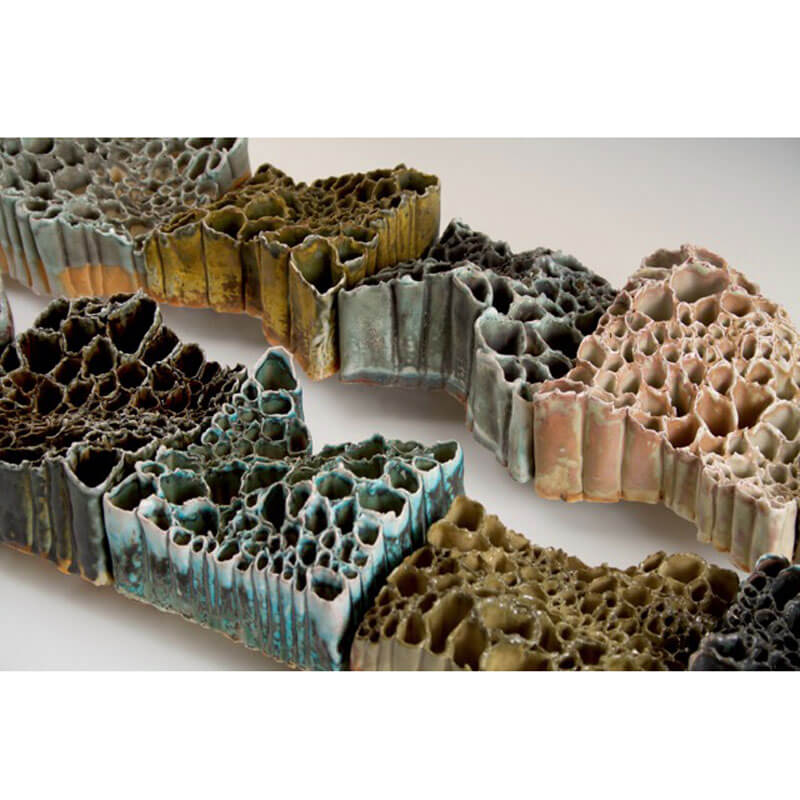 Fascinated by the forces of erosion and deposition I discover during my travels, my paper clay sculptures explore the impact of vulnerability, protection and duplicity. I’m captivated by complex, repetitive patterns found in the (in)/organic structures of desert plants, ocean coral, rocks, and human’s mark on the landscape. The remarkable beauty of desert canyons reveal historical marks left by unanticipated water events as earths history is recorded. As significant events occur in nature and in our lives, past events are exposed, new paths emerge, and events out of our control can permanently alter a river’s course, or respectively impact us for generations. Negative space represents the impressions of past events, past relationships,  words not said, the space between us -as I seek to provoke mystery through the interaction of separate elements. Using the tension and harmony I witness in nature as a metaphor for a window into our subconscious, the surprising strength of paper clay allows me to explore those disparate relationships by incorporating torn and fragile components ultimately representing the monumentality of even the most intimate, complex spaces.
