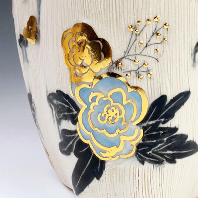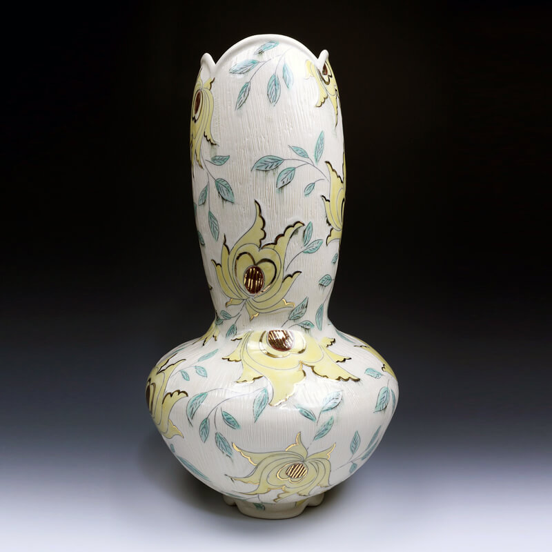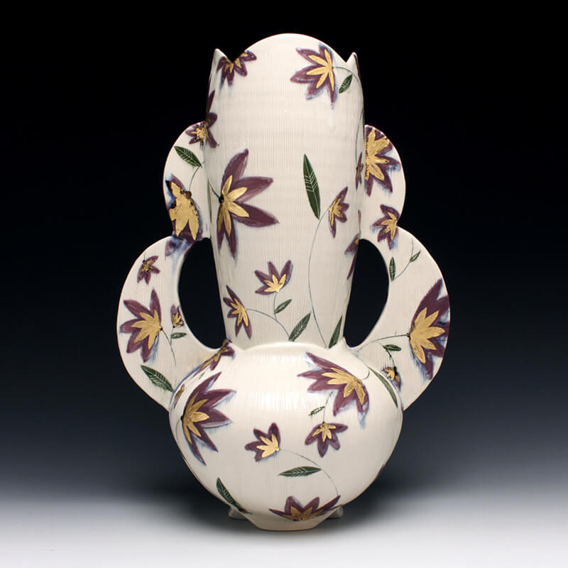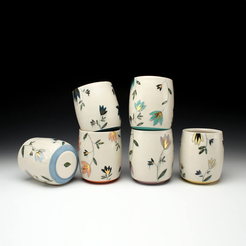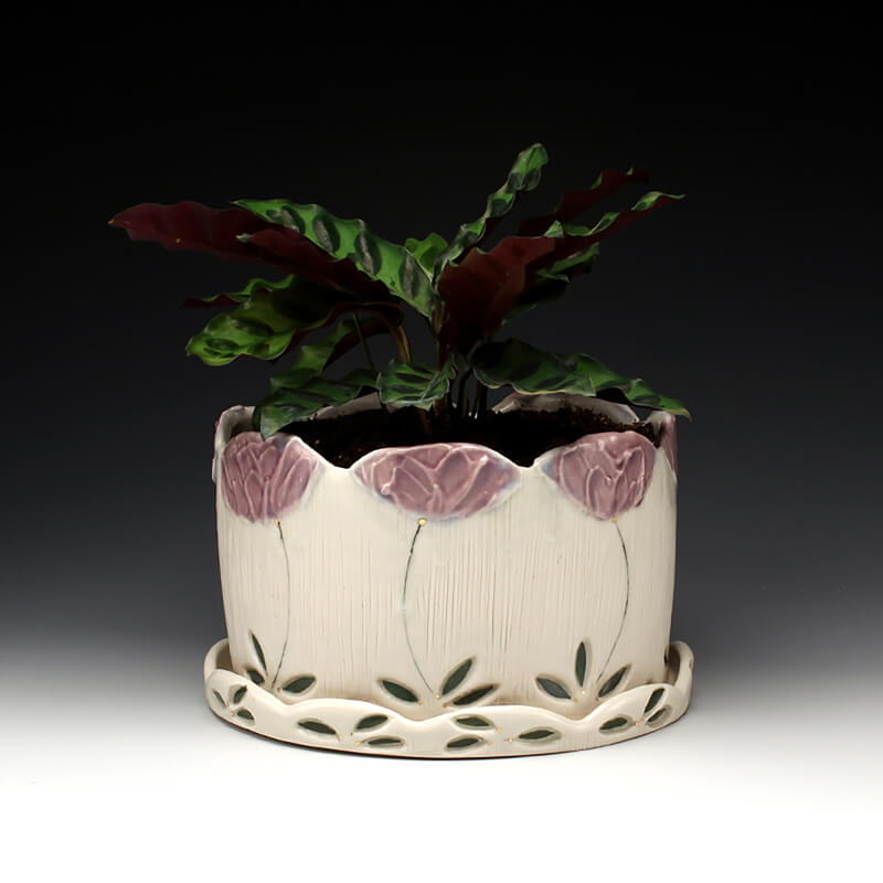 Time taken once a week to water, clean, propagate, and admire my plants has become a form of meditation and provides me simple joy. This time invested in each plant reminds me of my studio practice and the precise method in creating the surface decoration. When working on a piece, I am interested in how the layers of pattern and texture can call attention to the form, provide visual direction, and emphasize depth in its ornamentation. I hope that when viewing my work paired with their plant or making them a part of one’s own life, that the sense of the time, attentiveness, and love I have invested into both the ceramic piece and the plant that adorns it are deeply felt.