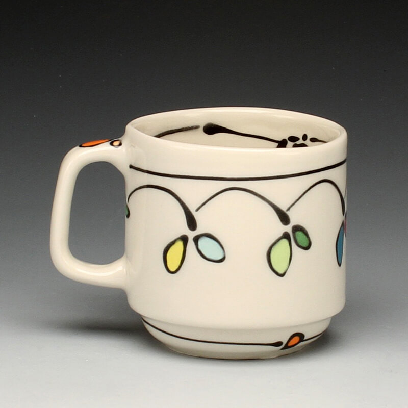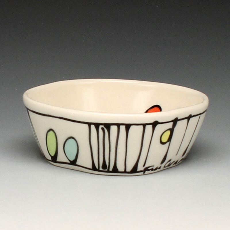 I need to make fun, happy, colorful things out of clay. This need to create and for those things to be shared with others, is inherent in who I am. Hand built pieces and functional pottery are created out of a mid range porcelain. The majority of my current work is done collaboratively through my pottery business Free Ceramics. Having my hands in both an artistic business and my own studio allows me to push my designs, ideas and challenge myself to keep evolving as an artist. Simple and inviting pots are made on a wheel or pinched out of large coils by hand and decorated with quick black lines and colorful dots. My imagination can turn images of rain, fireworks or candy into fun abstract designs that dance across the forms. I strive to make a beautiful and whimsical piece of art that makes you smile and is a joy to use.