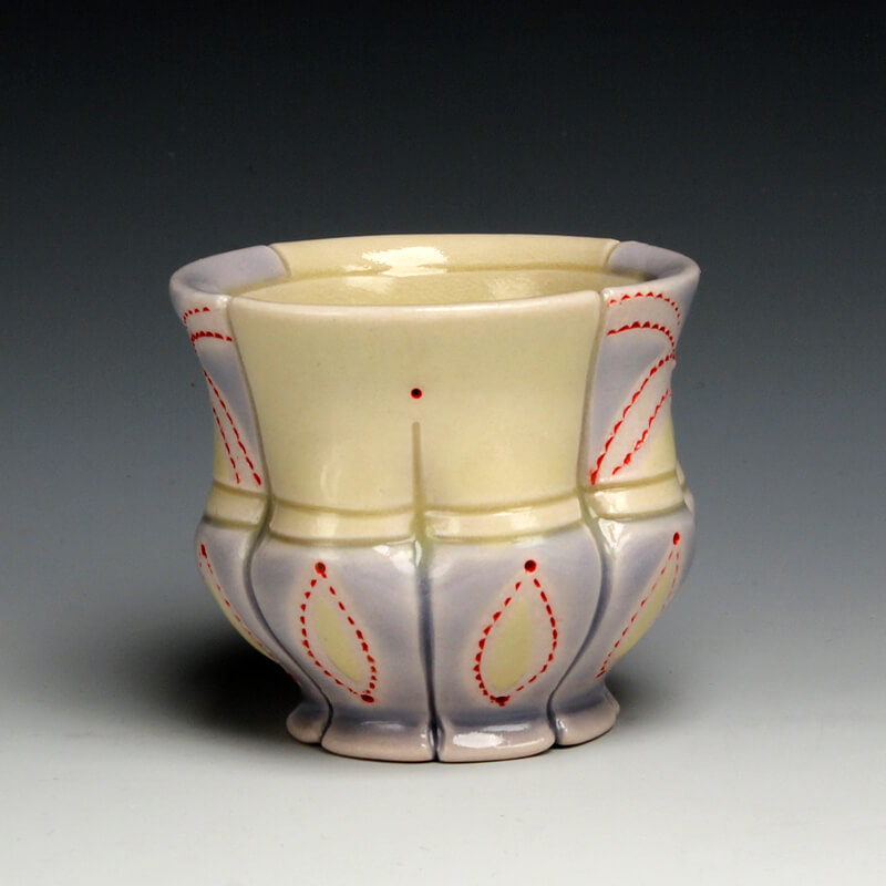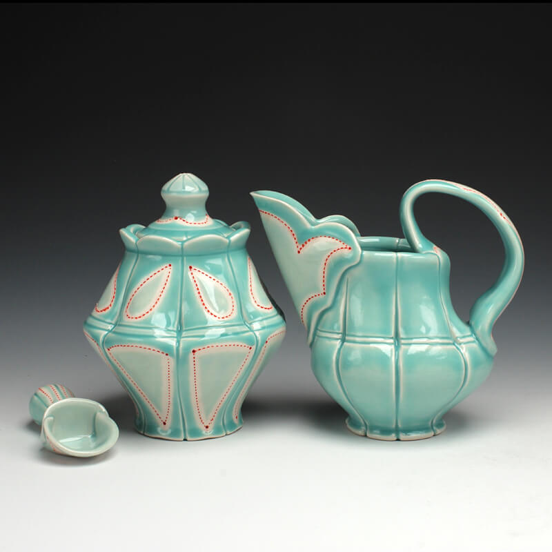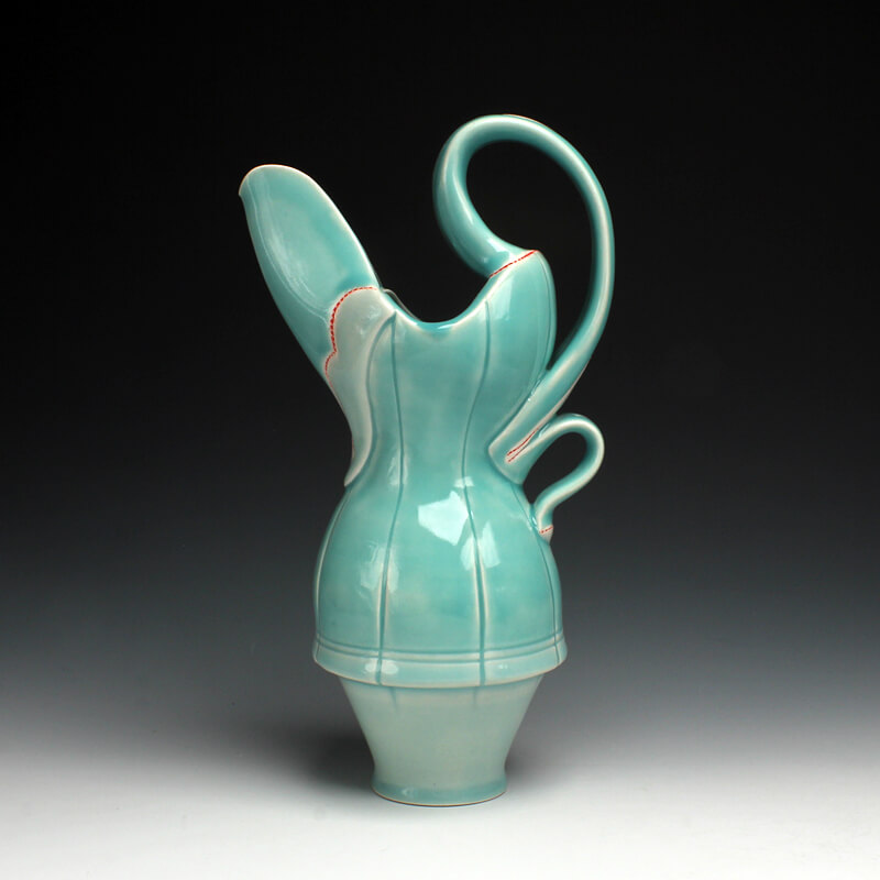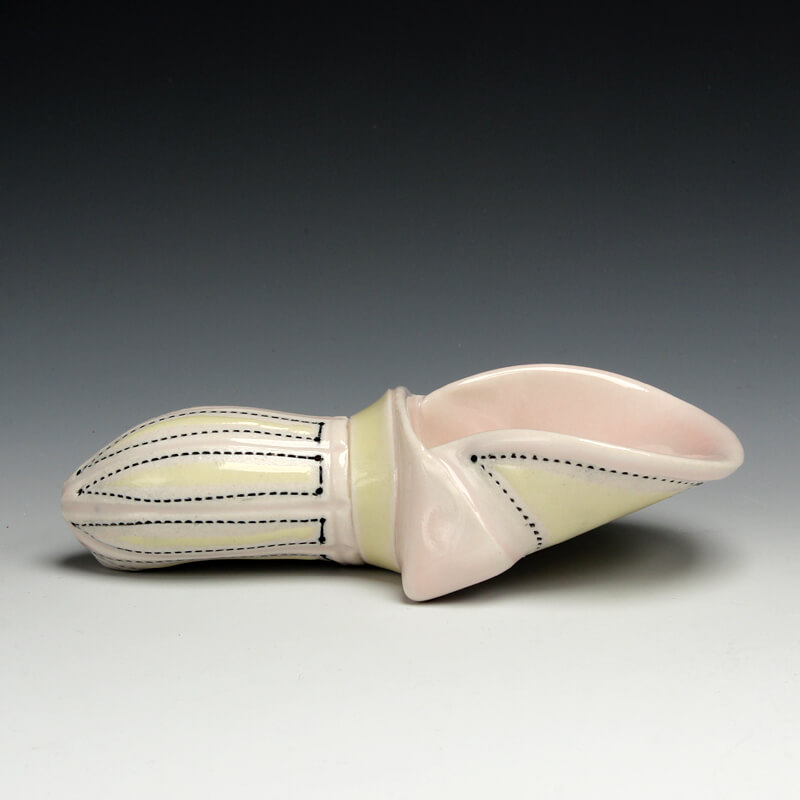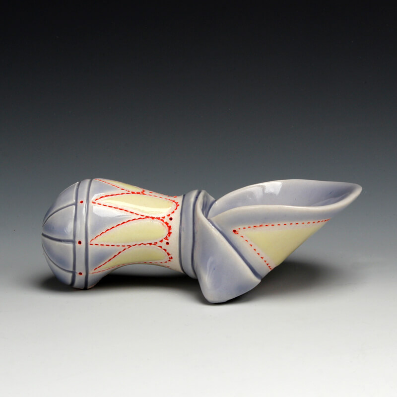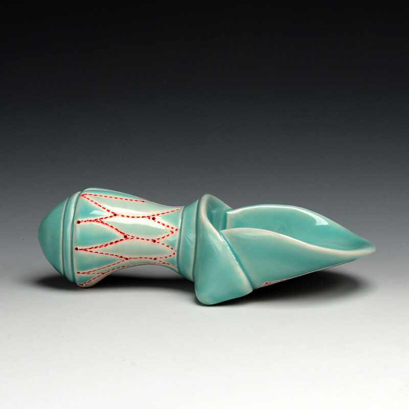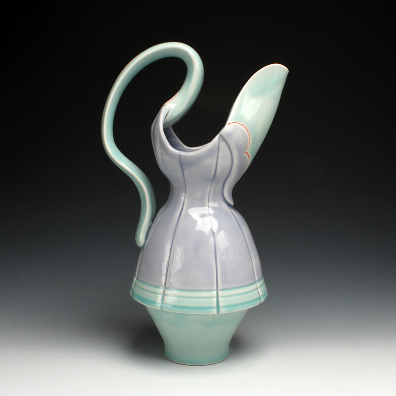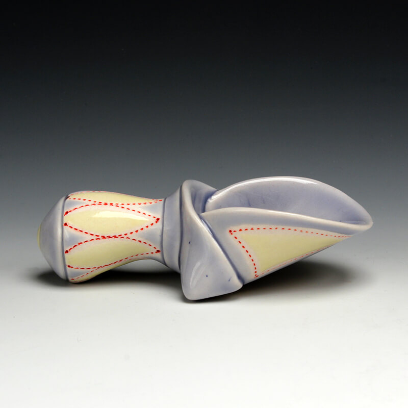 “Using wheel thrown and hand built porcelain, I attempt to seduce the viewer with graceful lines in form and clean, solid craftsmanship. Attention to detail and fluid movement throughout each piece is meant to enchant the viewer with nostalgia for childhood and dress-up.”
