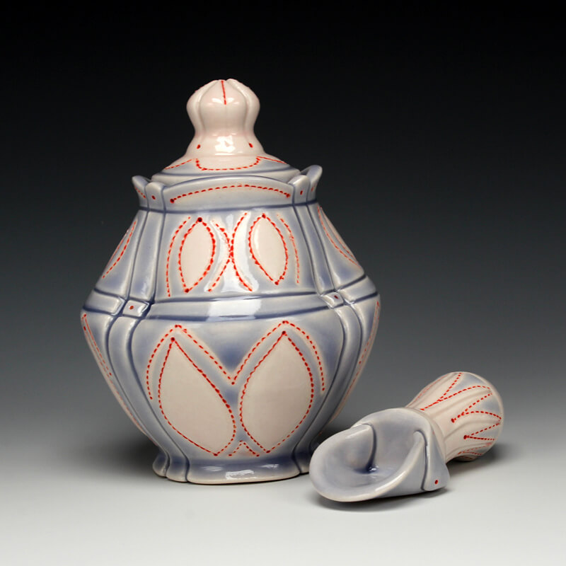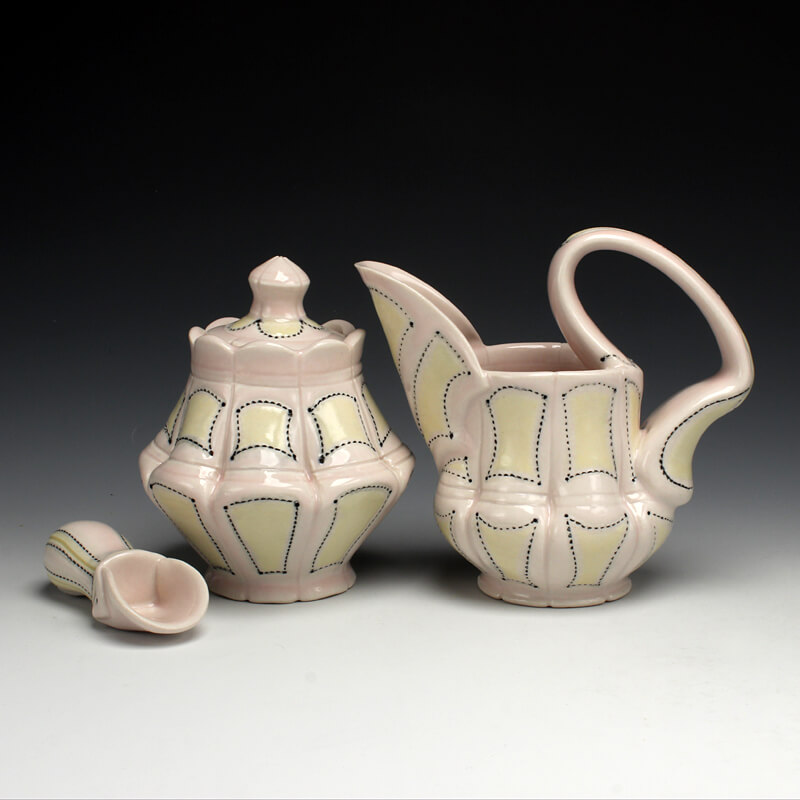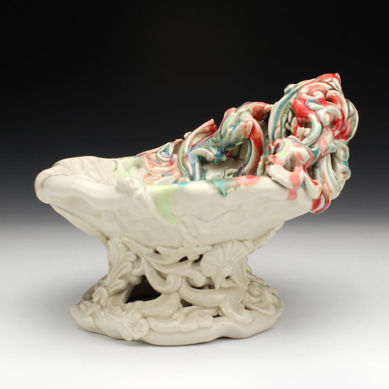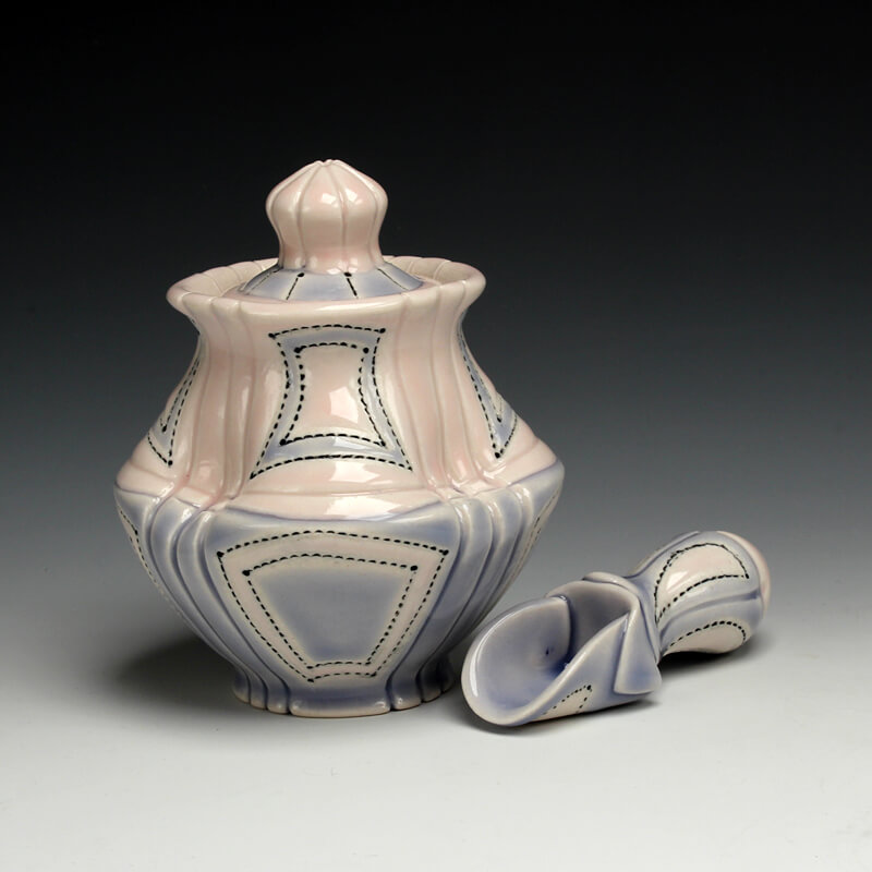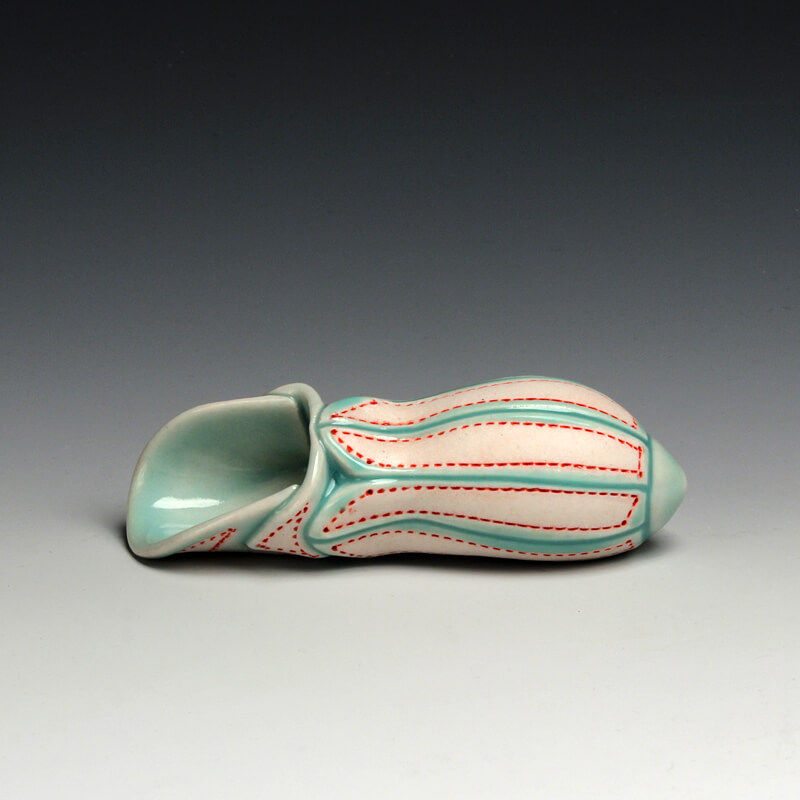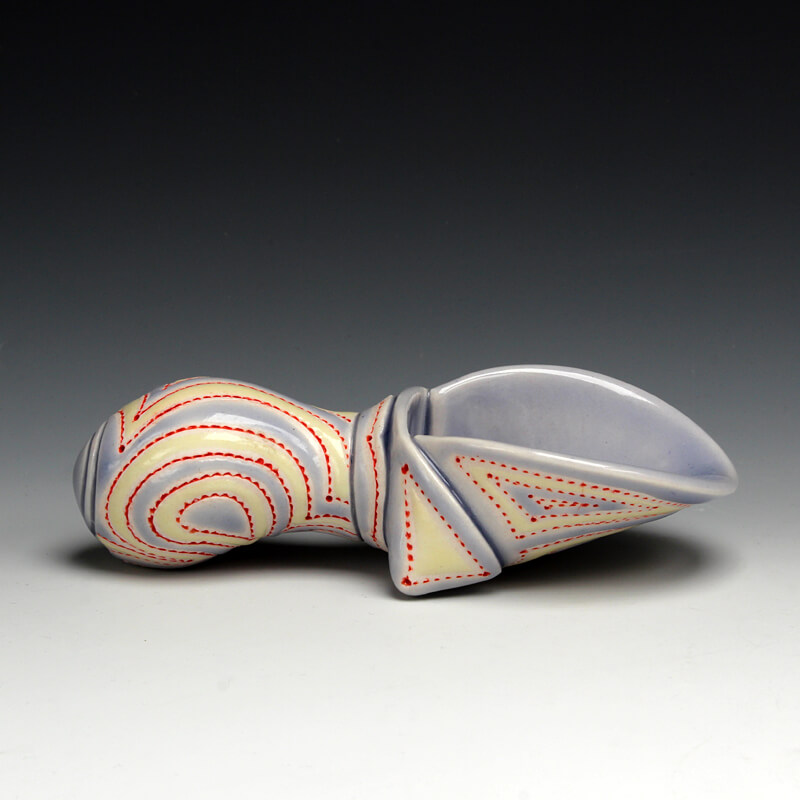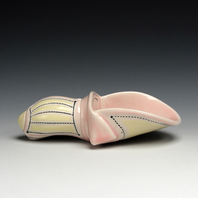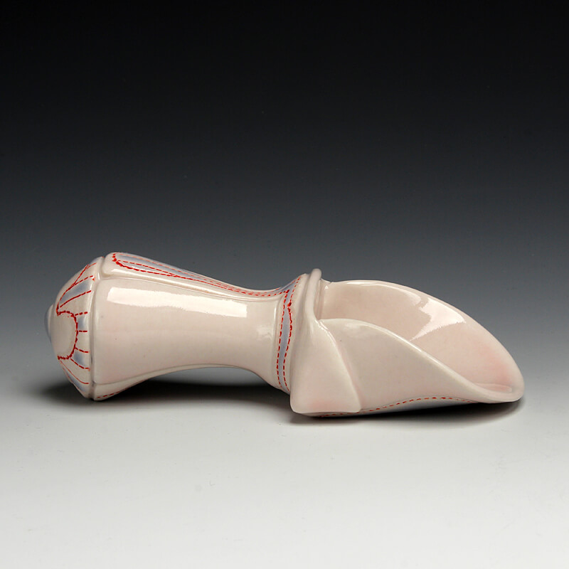 “Using wheel thrown and hand built porcelain, I attempt to seduce the viewer with graceful lines in form and clean, solid craftsmanship. Attention to detail and fluid movement throughout each piece is meant to enchant the viewer with nostalgia for childhood and dress-up.”