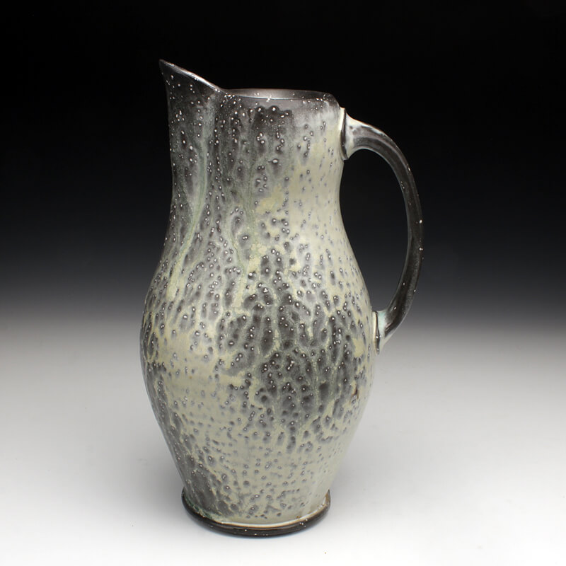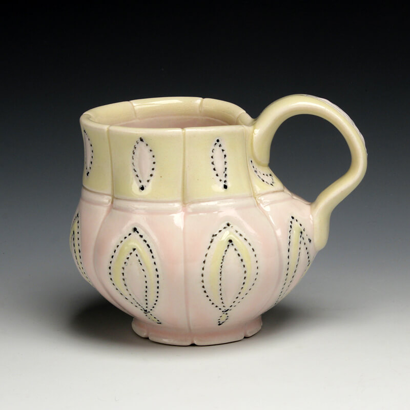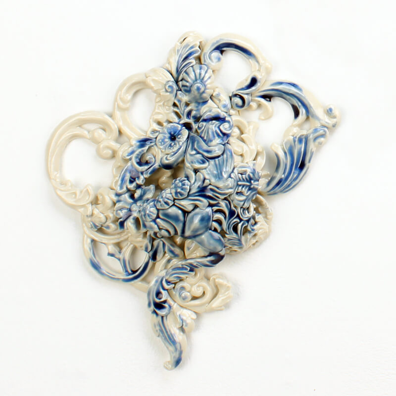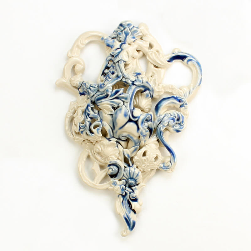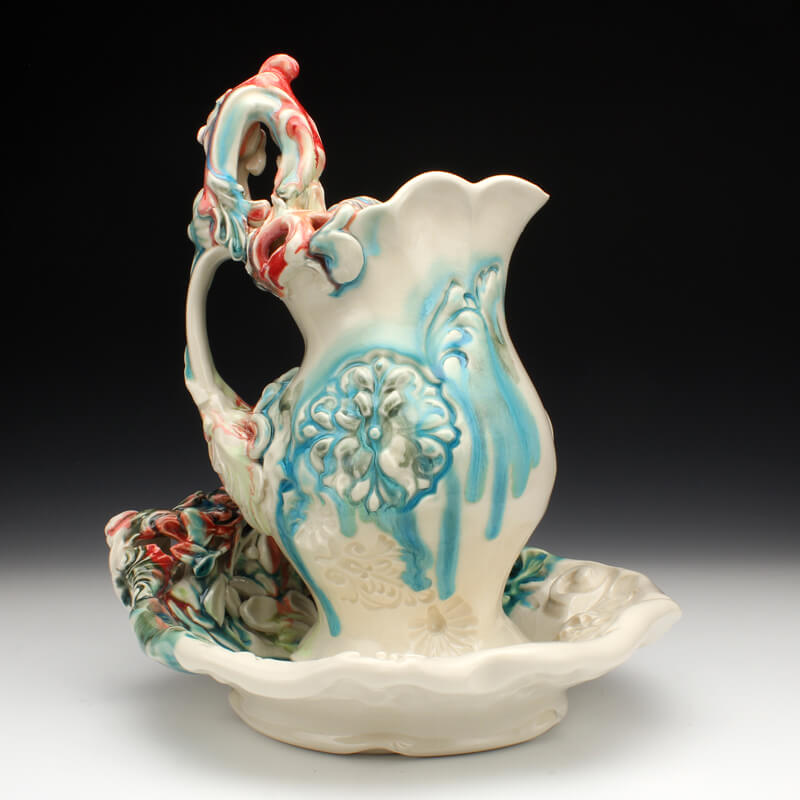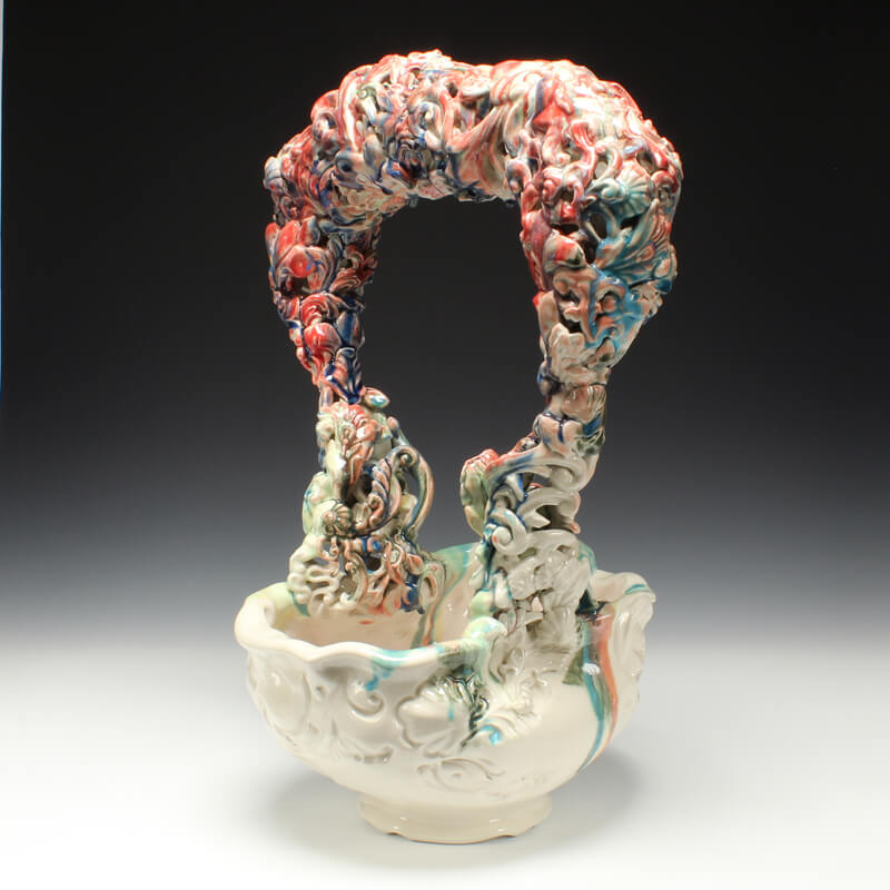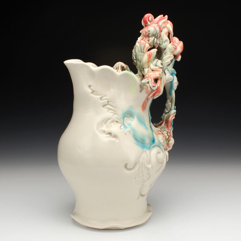 “My ideas of robustness and femininity are pushed and pulled in the surfaces and decorations of stout voluminous forms. Embedded and sprigged ornamental gestures emerge and converge with regulated thrown lines to create undulating, chunky curves.”