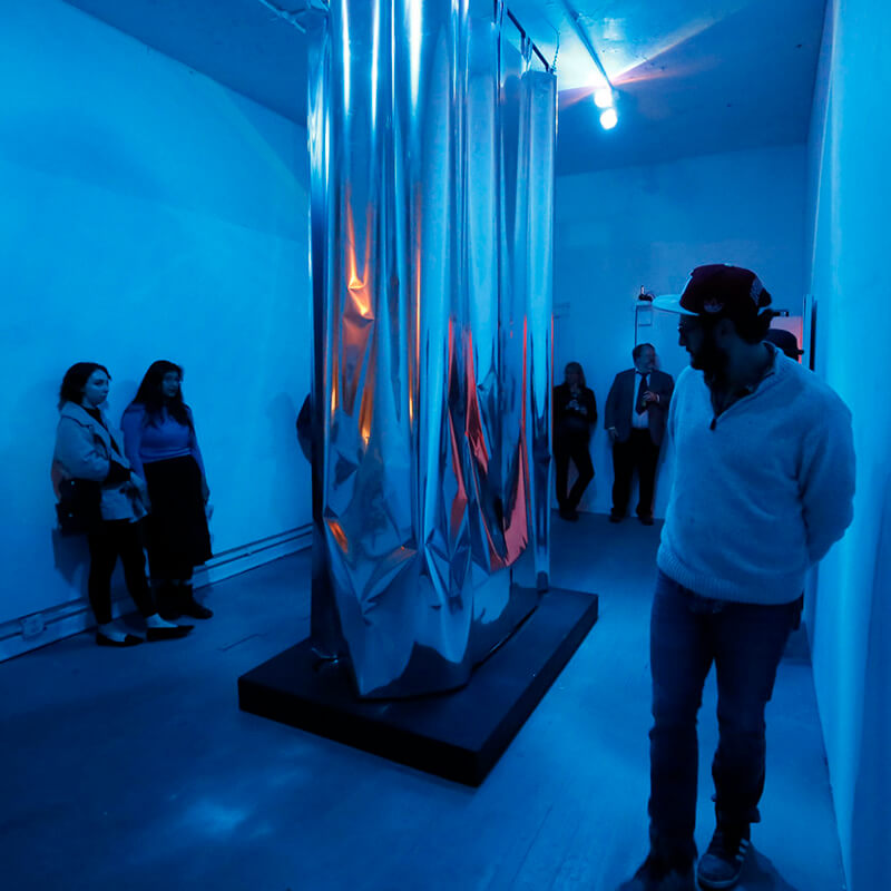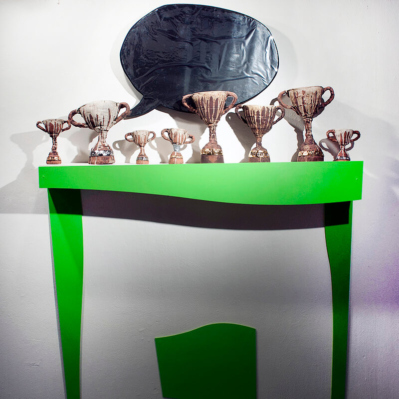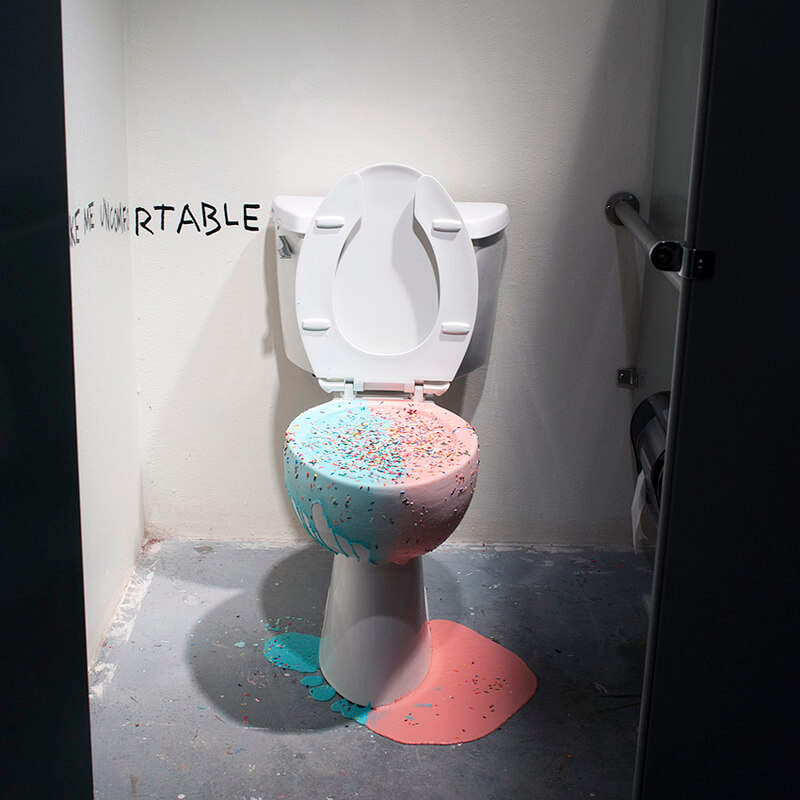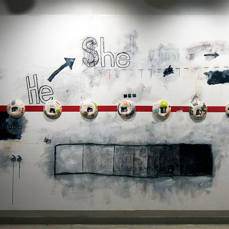 My background in graphic design, photography, and drawing informs the way that I treat my sculptural surfaces, which are often subtle but unapologetic. Because I am interested in how we understand gender through language, my work utilizes the double meanings and sometimes meaninglessness of words. I use both smooth and constrained gradations to exploit boundaries while candy coating the work in saturated colors to leave the viewer feeling that they might already understand my propositions. Additionally, using a language of symbols, I provide otherwise abstract concepts with literal dimensionality. It is the “subversively sweet” quality of the work that allows me to explore queer theory, philosophy, and language in a way that is simultaneously tongue-in-cheek and demanding.