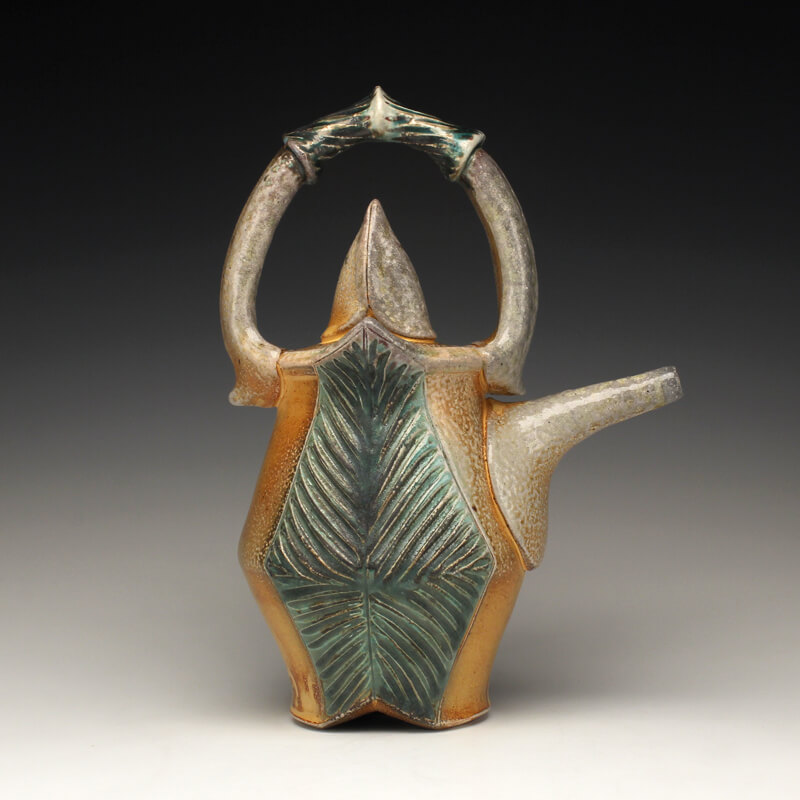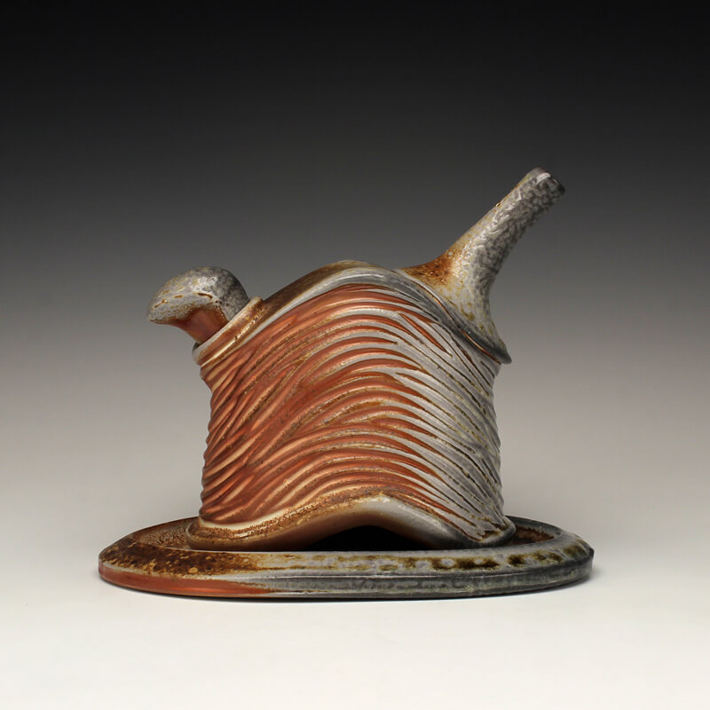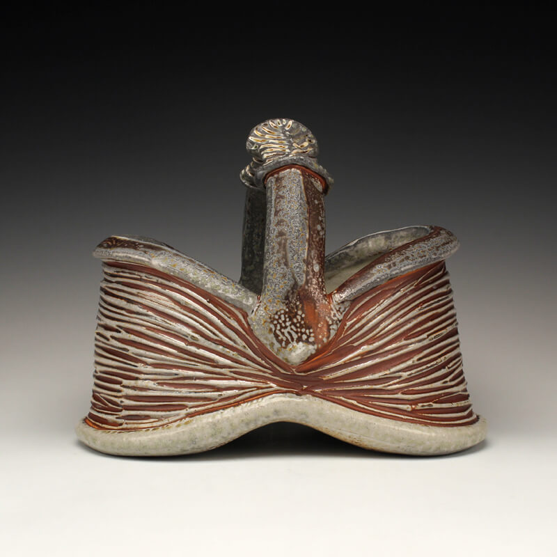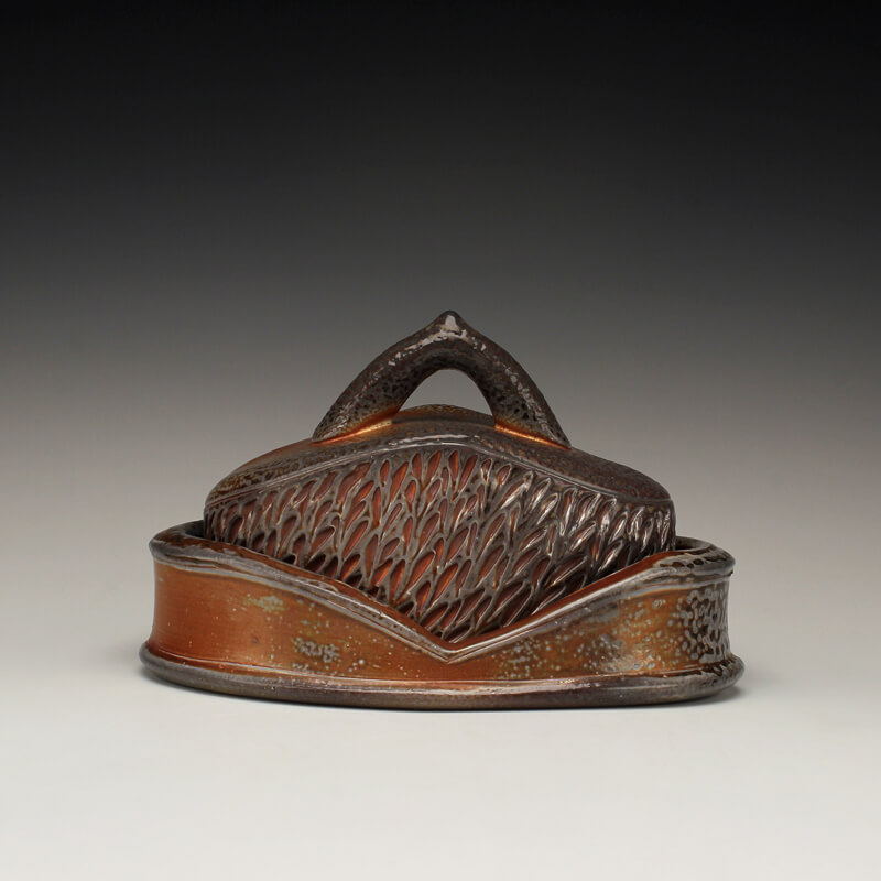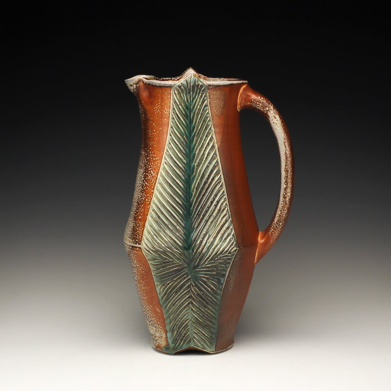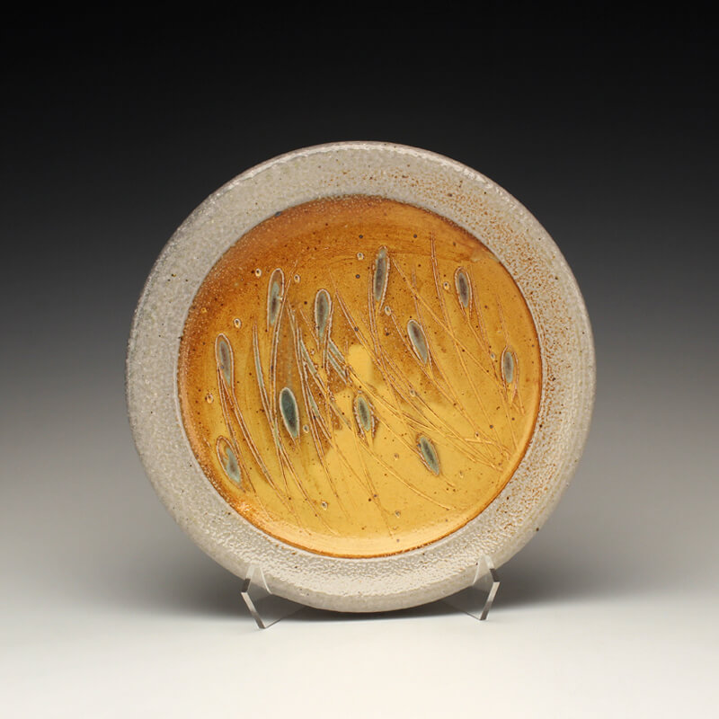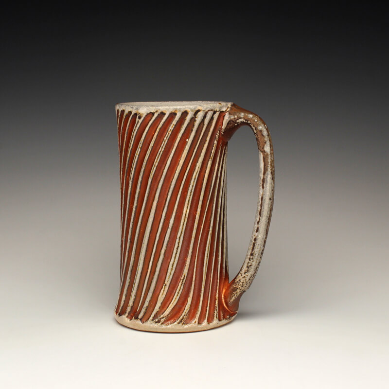 Integrating the way I experience the world with the way I design and create functional pottery is essential to my creativity. Whether rinsing garden tomatoes at the kitchen sink, or pausing to study wildflowers along the trail, I believe in taking time to notice the little details of life. I am just as awed by the way a leaf connects to its stem as I am the folds of a mountain range or bursts of clouds at sunset. I always view these things with an eye toward conserving and celebrating the environment that I live in. My work bears the mark of these values, resulting in uniquely designed pottery that is just as inviting to ponder and touch as it is to use and share. I make wheel-thrown and hand-built wares for the home, including bowls, cups, plates, pitchers, vases, servers, lidded jars, teapots, and platters. My color palate features earthy reds, deep browns, soft blushes of whites, twilight blues and natural variations of pattern that result from the wood and soda firings. To pair with these tones of autumn, I add glazes of brilliant ambers, warm yellows, shades of golden honey, and watery olive greens to the carved areas. Glazes spread and lightly pool across textured surfaces and highlight the curve of a handle, the lip of a tumbler, or the small peak or divot on a bowl. While I pay equal attention to form, surface, and detail, my pottery is most celebrated for its elegantly carved or pressed patterns inspired by nature. These patterns accrue a rhythm all their own as they swirl, spiral, and drape across surfaces, suggesting waving grass, ripples in a stream, stalks of wheat, terraced slopes, thistles and pods, or windblown tracks in the sand. Cradling a cup or bowl in their hands, people feel inspired to bring a sense of awareness and ritual into their lives. In the end, I hope that echoes of the natural world in my work invite them to consider the importance of conservation and conscious living. – Joy Tanner