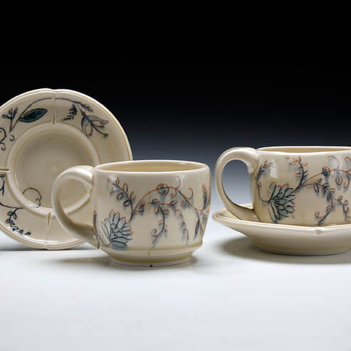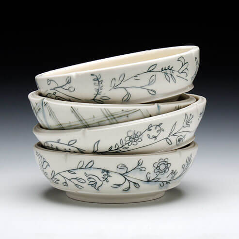 My forms are simple and paired down because I find that this often makes them the most versatile in their function. I want them to be open for interpretation. Whoever uses my pots is also an artist in my mind, creating compositions on my plates and cups, within my bowls and vases. By using my pottery, you complete the work I started. As I embed my pots with traces of my hand, I find myself wondering: how will you fill this space I’ve created for you?