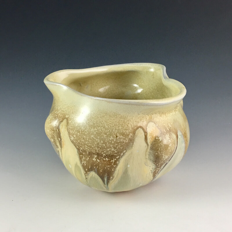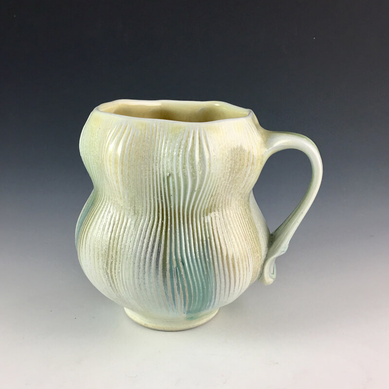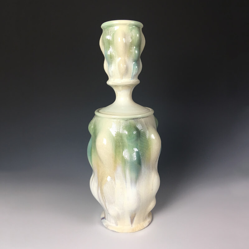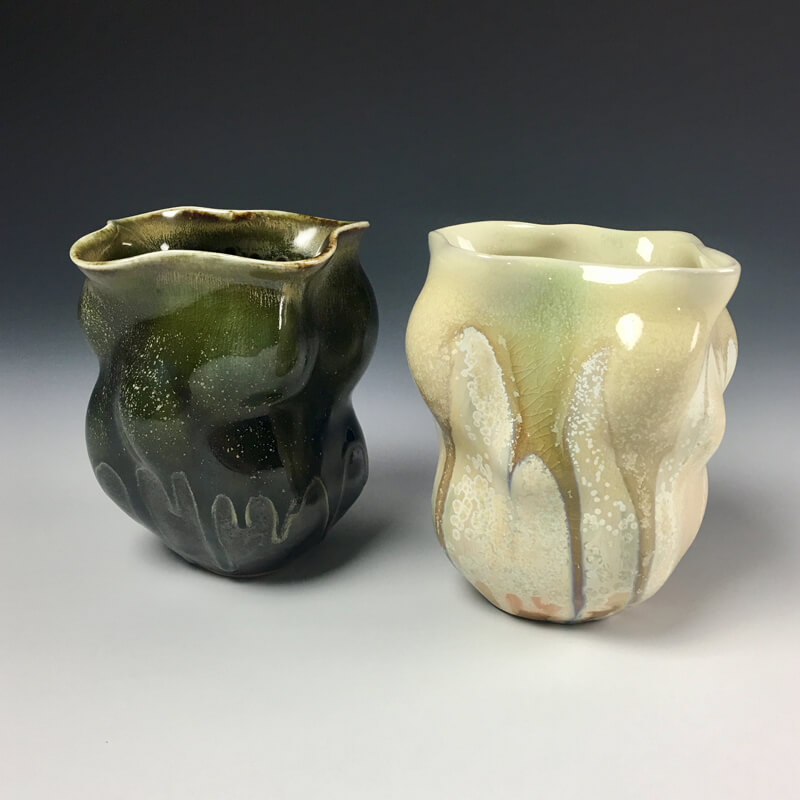 As the potter’s wheel accelerates, the clay naturally desires to spiral outward, much like the centrifugal force of the universe. It could be said that the potter acts as gravity, centering and condensing the clay like gas and dust inside a nebula. This body of work fuses my fascination with astronomy and passion for pottery. The universe is a never ending supply of form and surface which I use as resources to create abstract renditions of the universe through investigations in form, glaze, and clay body. The porcelain I use is incredibly elastic, which allows me to alter and push forms to the limit. Sometimes these alterations push beyond limits, as the clay begins to rupture, revealing additional information about the form. This emphasizes the emptiness inside each vessel as it relates to the vastness of space. The porcelain clay body also results in brighter colors and works beautifully with flashing slips in atmospheric kilns. Atmospheric firing best compliments my forms; reactions from salt, soda, and wood ash emphasize the alterations and textures of the surface.