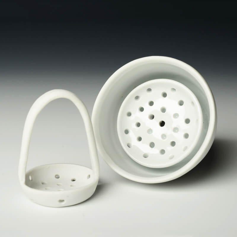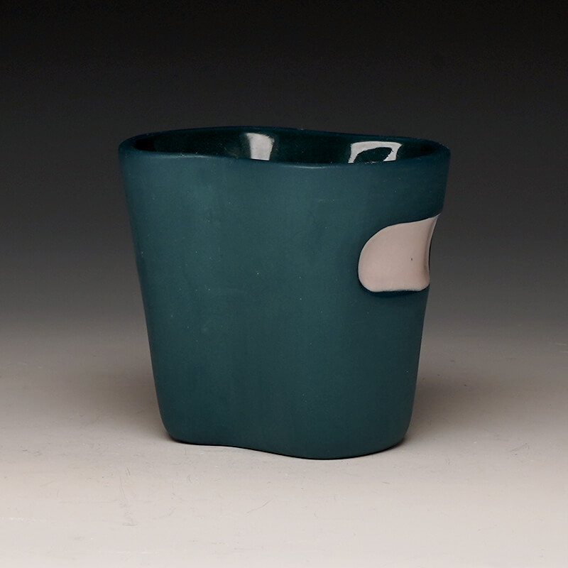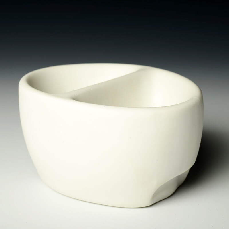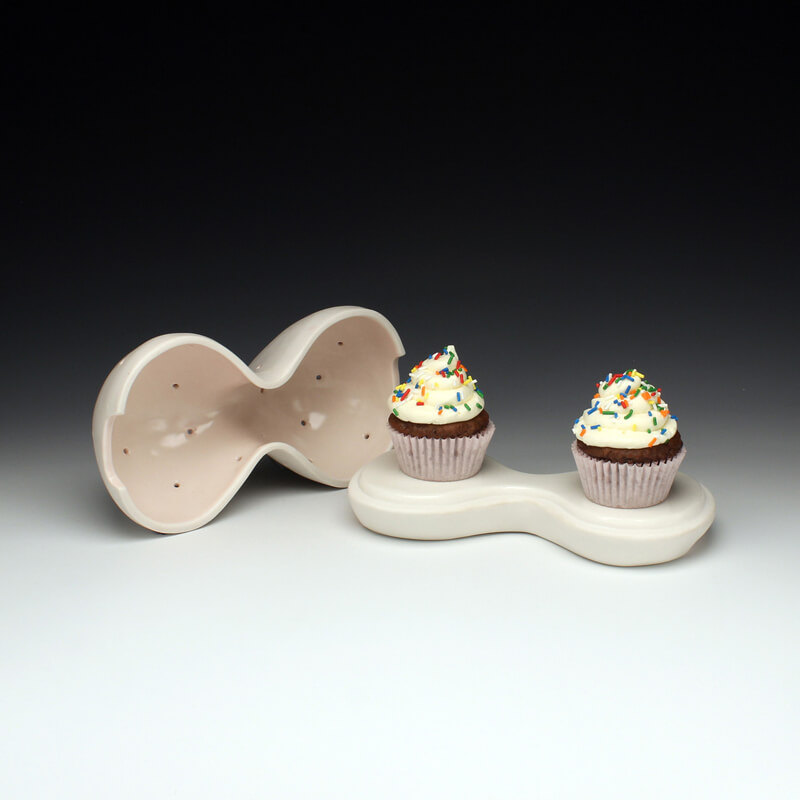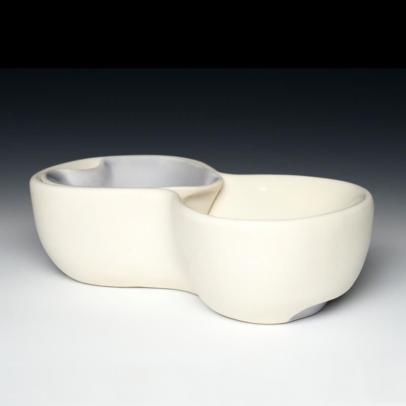 Currently, I am creating porcelain vessels that are designed to aid in the act of self-control over food. The vessels are intended to allude to the feeling of fullness and satisfaction by creating forms that are larger than the space designated to eat from. Small pops of color in these otherwise sanitary white forms give the user a domestic comfort regularly associated with the American standard of consumption.