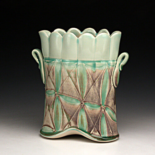 My intent is to make useful objects that challenge the familiar. I strive to make well – crafted pottery that records the transformation of material and process. I use volumetric forms that suggest sensuality in the curves and bends of the clay. Soft celadon glazes highlight the decorative marks that pattern the rich surfaces of my pots. Within this body of work I bring together influences as diverse as woven crafts, antique glass, and the Art Deco period. These influences combine to reveal the decorative language in the details of each piece.