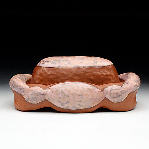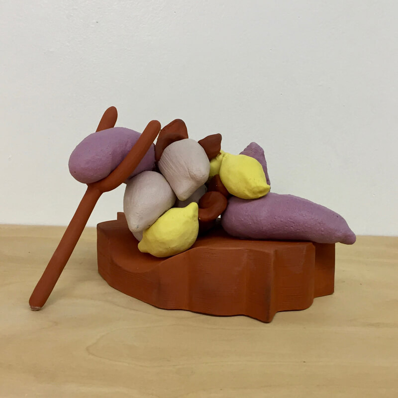 I carefully form and accumulate multiples, finding comfort in the plenty. Using the multiples to build quickly and directly, I intend to use clay sympathetically and to expose its raw and malleable qualities. I use and misuse the visual language of pottery, manipulating structure and abstracting the familiar. Masses of earthenware adjust to these transgressions, making compromises that reflect the body’s systems of counterbalances. In this reflection of movement, proportion and scale these compositions become bodies that enact similar processes to my own. Losing fleshy residency the soft vegetal abundance dries and becomes brittle. These objects are vehicles by which I come to understand myself.
