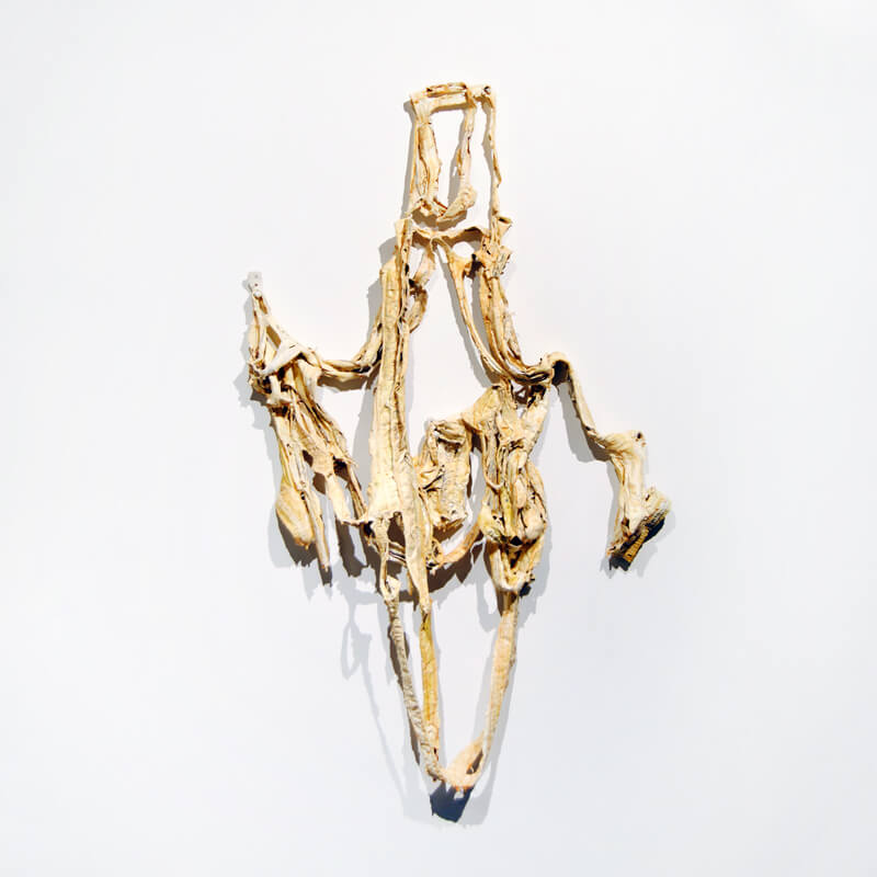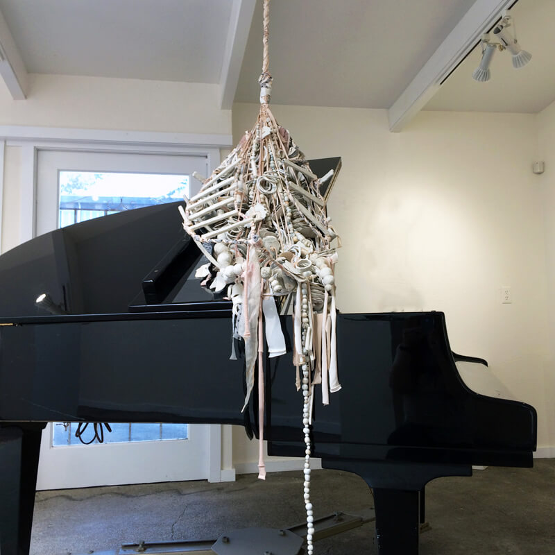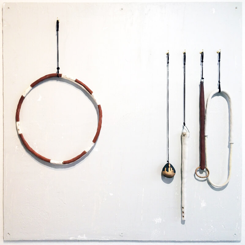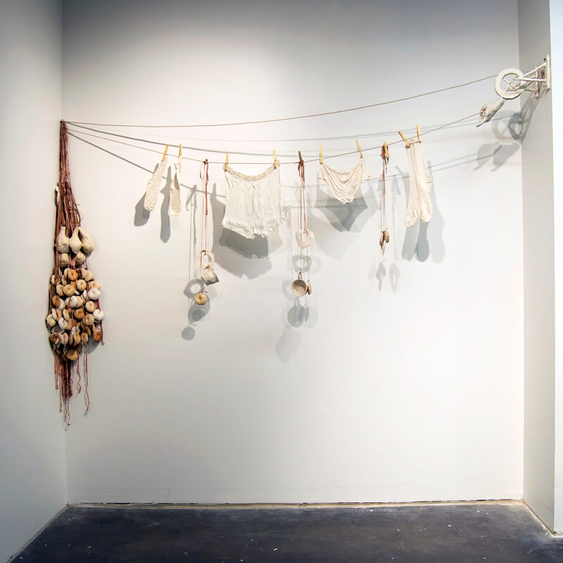 Intimacy is a ceramic bowl belonging to a wooden table. It is holding a cup in your hands. Putting your lips to its lip. It is a sweater that is worn. How its fabric feels on your body. It is a way of holding. It is breaking down space, while also creating a space. It is searching to understand boundaries and proximities. Intimacy is feeling at ease. It is soothing and rhythmic on one side, while sharing a wall with sacrifice, heaviness and burden on the other. Intimacy is touching, holding, stringing, swooping, carrying, and attaching.Clay’s ability to form intimate relationships is two fold: First, for the artist, there is the physical touch and time going into the work that creates a bond. Secondly, there is the work. Ceramic work traditionally being an object, is created to be held. This work is searching to understand the intimate experience for the viewer, as each viewer has their own intimate relationship to a work of art. This is a synergistic relationship created by the vulnerability of the artist, and the viewer’s reaction to it. The work plays conceptually with clay’s traditional role of ceramic objects living in hands, routinely as well as ritualistically, being used. The work aims to explore the spaces and conditions, both physical and psychological, in which intimacy is created.