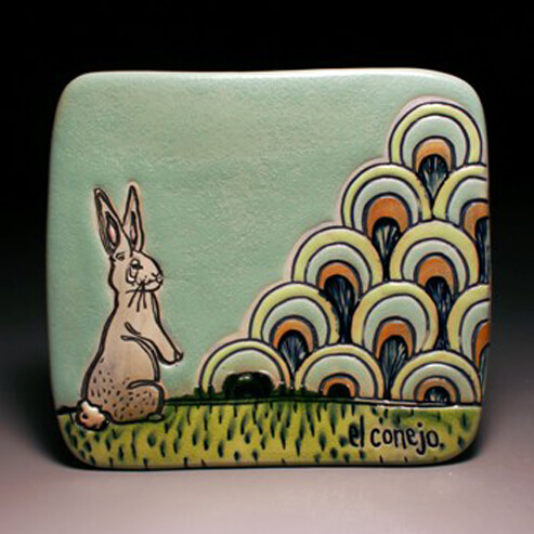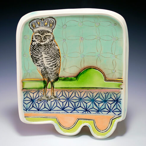 My simple thrown forms beg to be activated with an array of images and vibrant color. Using line, language, image and pattern I create a balance between the narrative and the formal composition. By employing birds and other animals to act as metaphors, I can encompass several human conditions that often embrace humor and irony. Some of these ideas include the desire for social interaction, nurturing treasured relationships and the naivete associated with childhood.