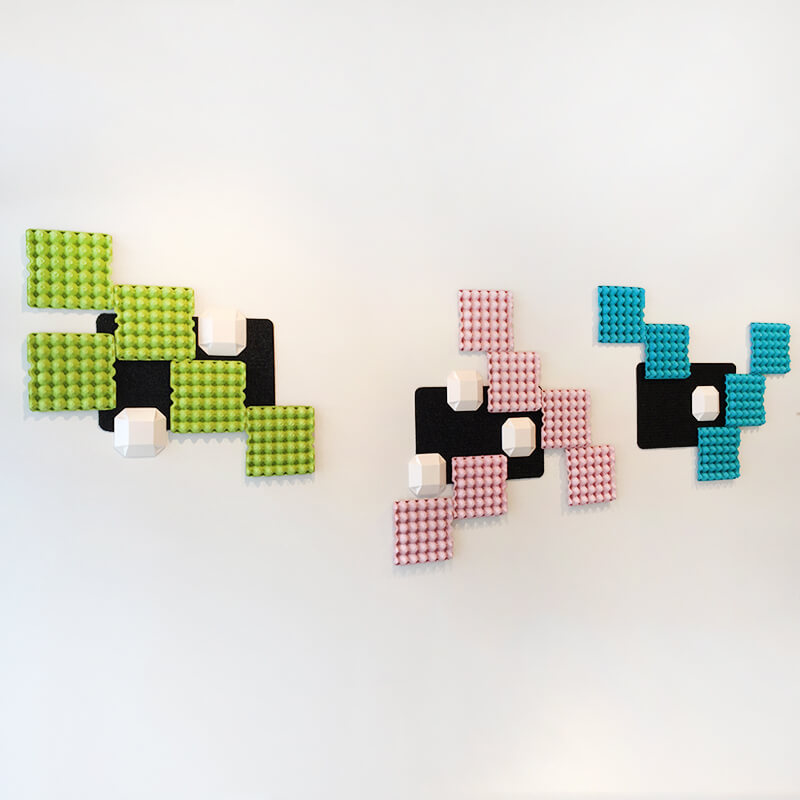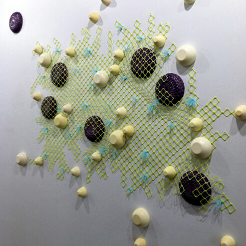 I assemble and re-assemble these forms, at times combining various bits and pieces into new objects, alternately using the casts in an unaltered state, repeating each form multiple times, building larger abstract installations, creating emphasis through repetition. Light and shadow on lustrous white ceramic surfaces emphasize the lines and planes that originally called to me. I add in other materials, balancing an abundance of color and texture with the purity of the ceramic forms to create large compositions that encompass walls and rooms.