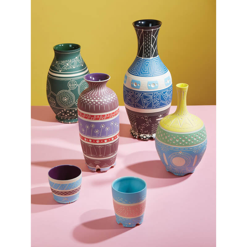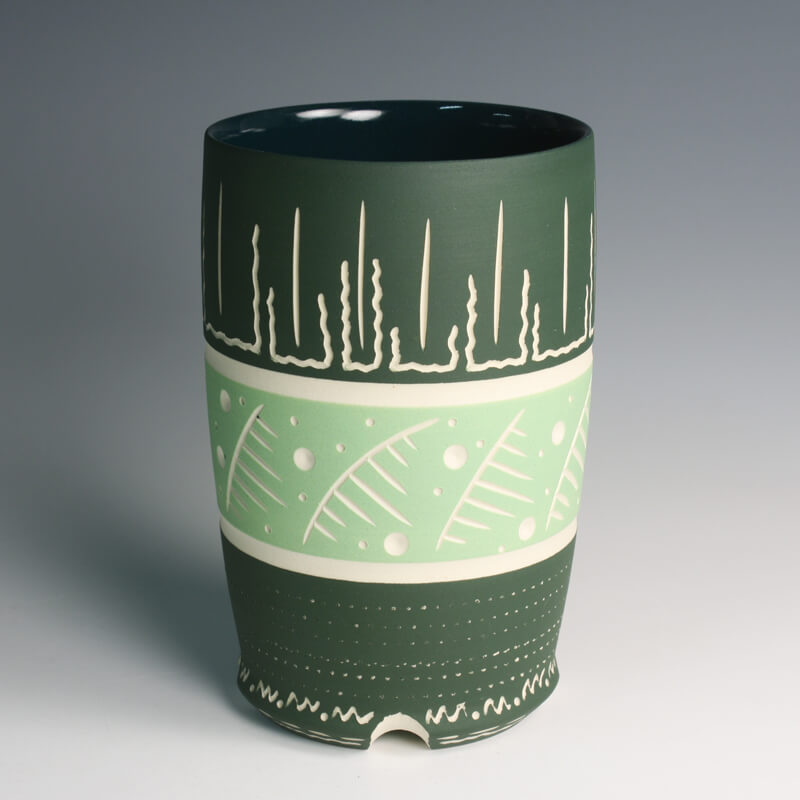 I build abstract compositions using a simple vocabulary of curves and lines on fields of color. Improvisation is key in my work as a directional force because clay demands a high degree of technical skill which can stunt creativity. I hope to use the abstract nature of color to tie my designs to emotions and experiences and to explore a world of meaning not within reach of any other design element. On top of these fields of color, my mark making is precise while the overall designs are unplanned. The play between improvisation and precision is at the heart of my work. Like a rorschach test, I explore the connections conjured in the mind when there is a lack of representational imagery.