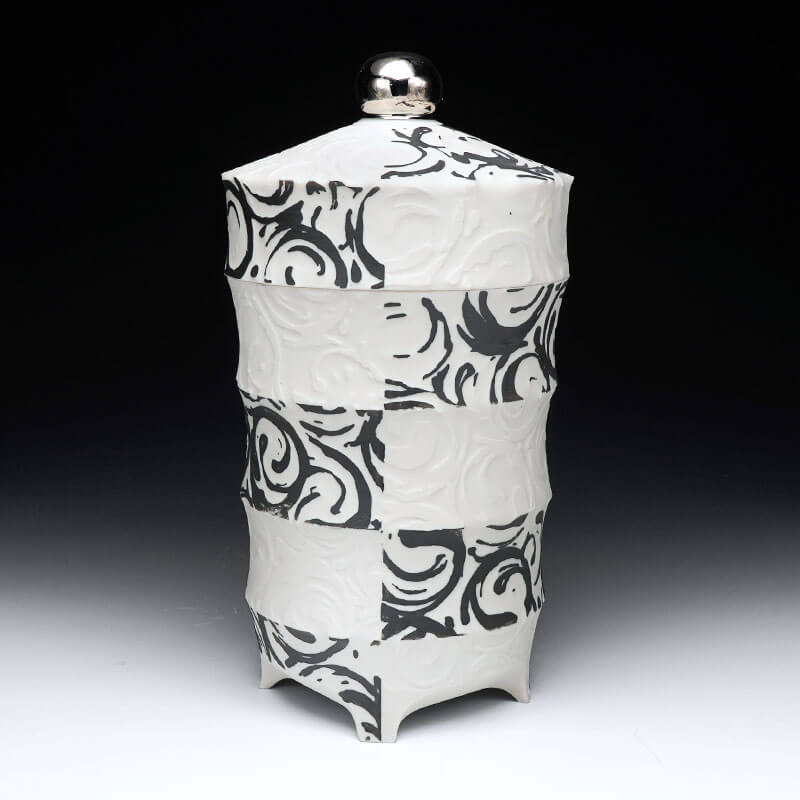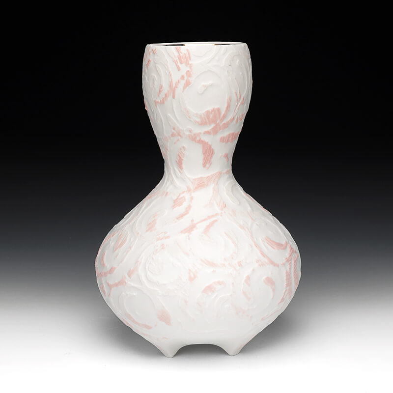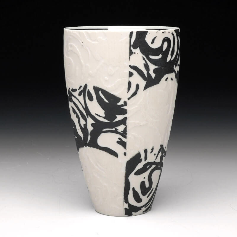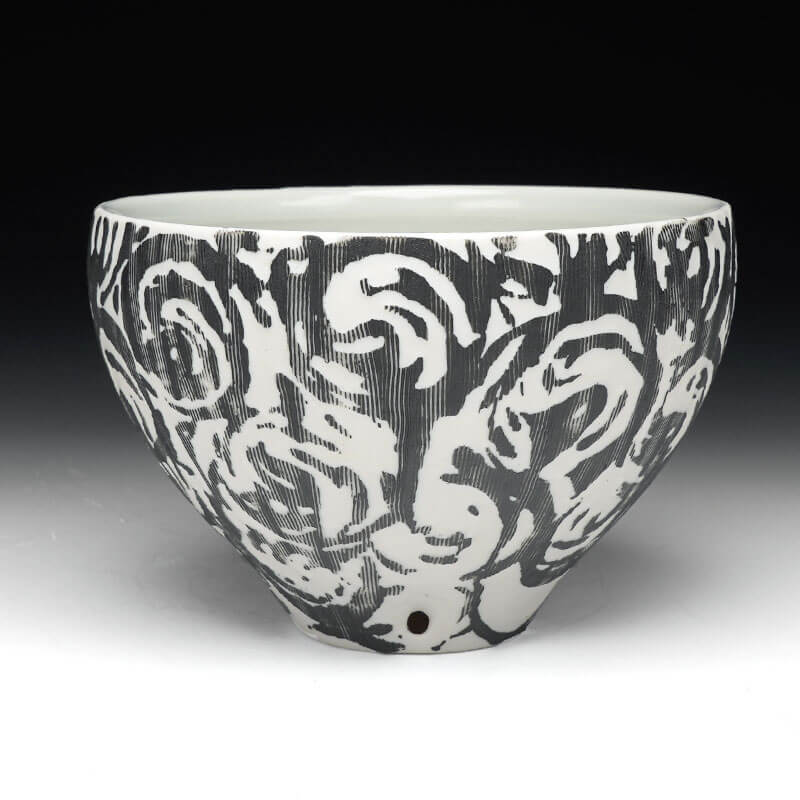 Wooten utilizes the flaws, blemishes, and marks created in the process of making, and recontextualizes them within intricate patterning inspired by traditional status-imagery, patterns, and materials. Wooten’s work explores historically utilitarian and simple forms. These pots are then adorned with process and gestural marks abstracted into status-based patterns, such as vine scroll and floral imagery. The work aims to take process and residual information left by the hand to emphasize the importance of the human mark within the context of status-informed pottery. There are aesthetic and conceptual ties to both Japanese ceramics and modernist design that are considered within the work, both visually and metaphorically. Form and silhouette are of the utmost importance, as they serve as the canvas and frame in which these explorations take place. The pots, although functional and minimal, then serve as both objects of desire and functional vessels for consumption or display.