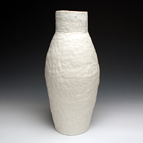 The works are hand-pinched vessels inspired by iconic forms found throughout ceramic history. They are formal explorations in shape, volume, color and composition. The slow and rhythmic forming process employs very few tools, yielding fresh, dynamic silhouettes. The opaque glaze is soft to the touch like a worn river stone. Fingerprints remain in the porcelain surface celebrating the slight imperfections of the handmade object.