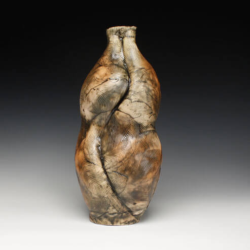The goal of my residency was to create a number of pieces related to the human figure. I worked with this idea about fifteen years ago, and find myself returning to the forms with new interest. Currently I am using translucent porcelain to create female figures which show the evidence of aging. The techniques I used produced delicate wares which warped and sometimes cracked in the firing. I plan to base these translucent works so that they may be lit from the inside, revealing their translucency and fragility. These forms are contrasted with more voluptuous, vigorous forms suggesting the promise of youth. I once again found myself drawn to the plants surrounding the studio. I selected leaves to impress on some forms as a connection with the natural world. The concepts I am exploring include contrasts in fragility and beauty; robustness and fertility. I experimented with two firing methods for these forms, electric oxidation and soda reduction. The “thinware” did not hold up well in high-fired soda kiln and seems more suited to mid-range electric firing. Other ideas arose during my residency work time: Scale, groups, lighting, and utility. It was a luxury to have the time and facility to let myself follow ideas in different directions. As a result of the short term residency at the Red Lodge Clay Center, I have several directions to follow for this body of work and will continue to develop it as I return to a more limited studio schedule at the end of my sabbatical.