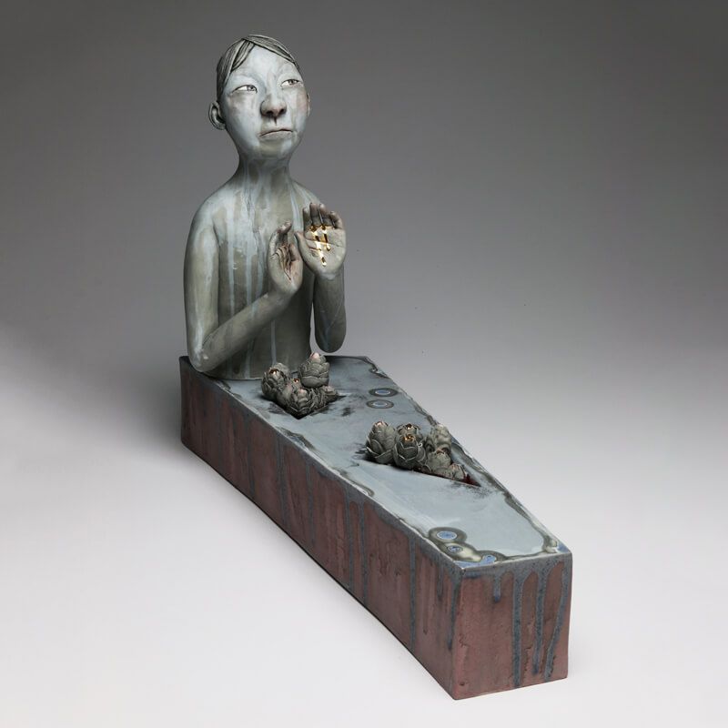 In my newest project “My burden”, I’ve expanded my work to include animals and flowers. I was inspired by Christianity which emphasizes beauty in pain. This duality is part of a more universal human experience. “Hardship and pain never go away, but remain a part of us—they somehow harden and become beautiful.” I use ceramic flowers as a metaphor of this relationship.