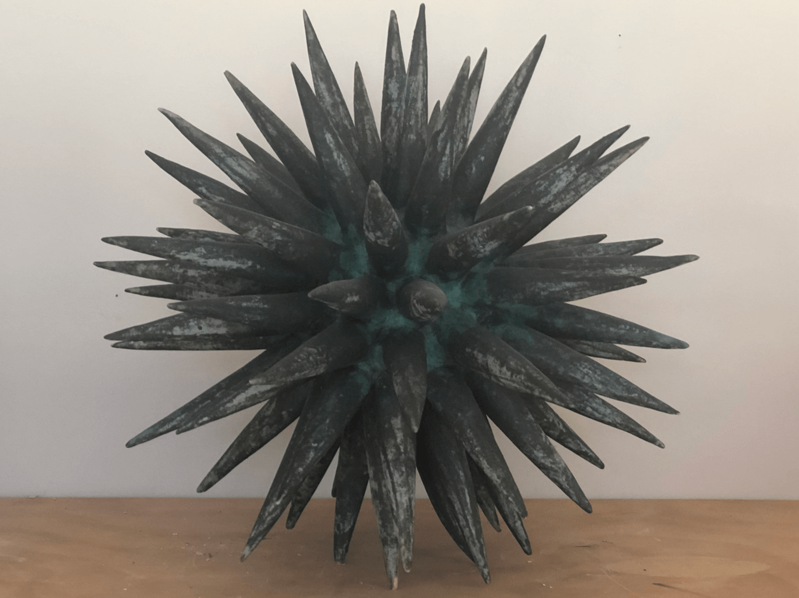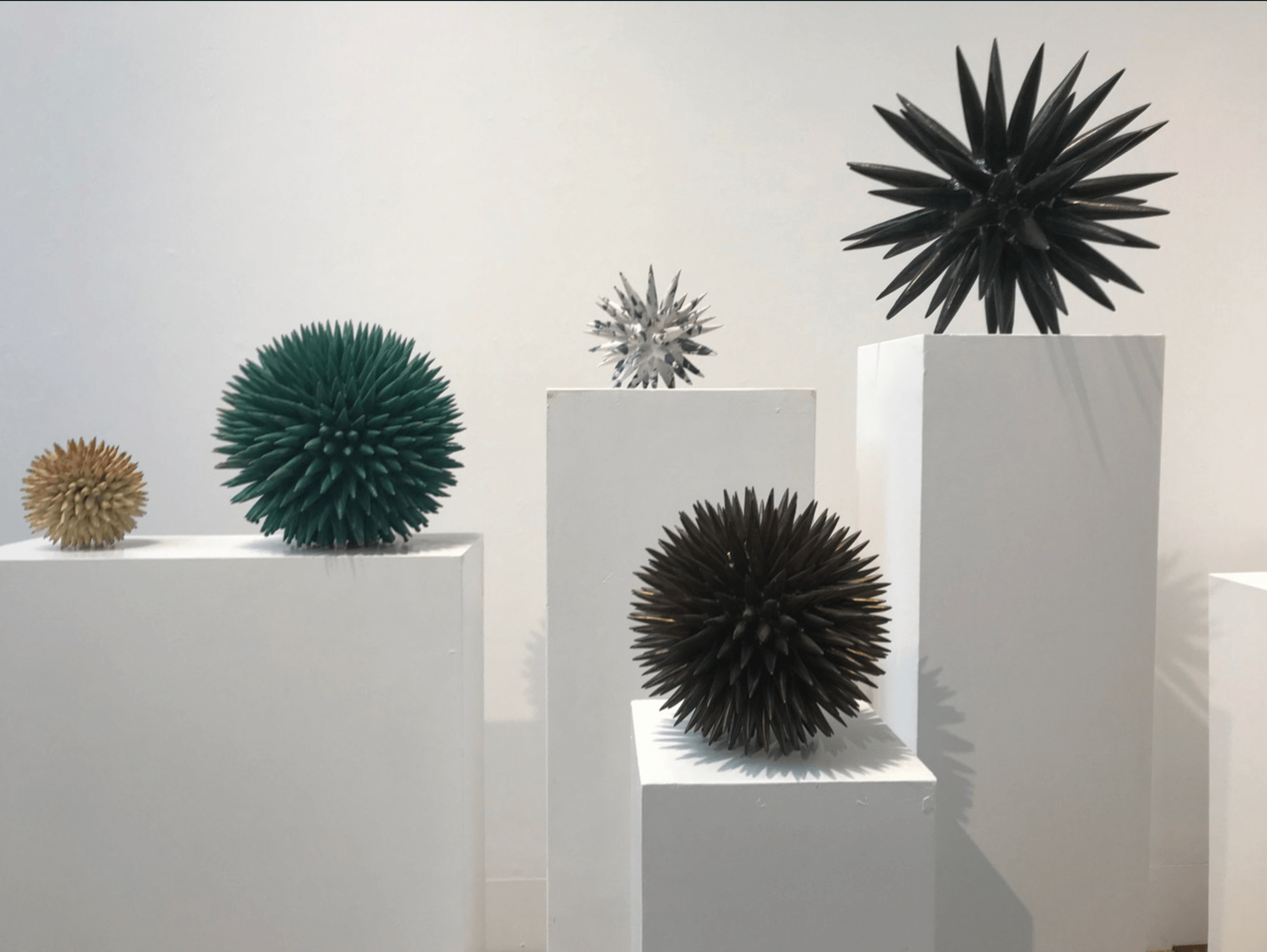 In my current sculpture, I am exploring the patterns and the layers in natural forms. My pieces don’t replicate nature but develop organically on their own. Using a sphere shape as a starting point, I am making sculpture that one doesn’t just look at, but looks into. The radiating spikes create a larger implied sphere. For glaze, I spray a base color and then create lines using an application bulb. In a sense, painting two dimensionally on a three dimensional surface, creating movement and a strong contrast. I am also very interested in alternative firing techniques.