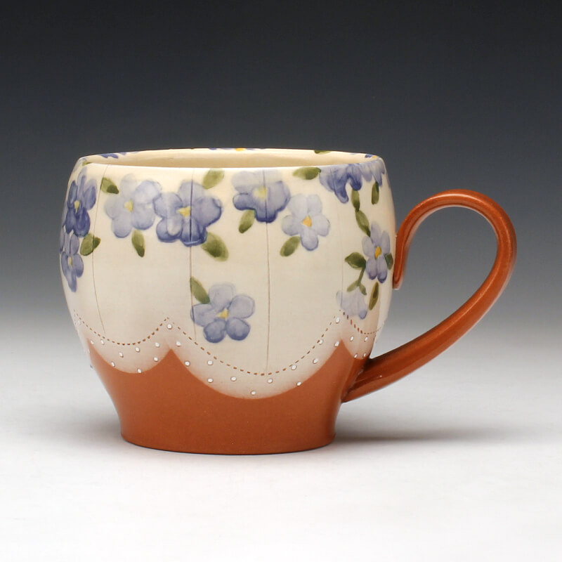 I throw simple, clean-lined forms from earthenware clay and apply white slip to create a blank canvas for drawing and painting delicate motifs. As my imagery progresses across a vessel, I think about how the surface of a pot can transcend a cloth canvas. Through the repetition of floral patterns and systematic mark making coupled with painterly underglaze application, my process enables me to move fluidly between quilting, pattern design, and traditional ceramic techniques. I aim to evoke a sense of nostalgia through the catalyst of surface adornment.