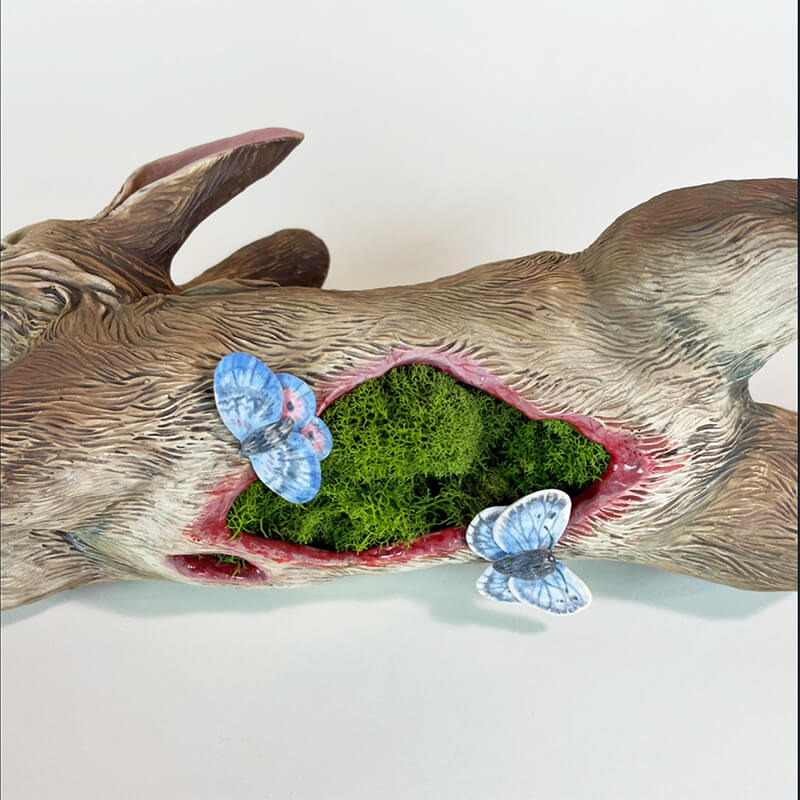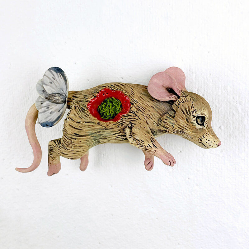 The work I make focuses on the small and vulnerable. Rodents, birds, rabbits, and fawns are often the main subjects in my work. All of these creatures are characteristically fragile and tender, but they also represent resilience. They are everywhere within nature despite being so susceptible to violence as prey. I often include a wound or genetic anomaly to my figures with foliage peeking out, or moths and butterflies sipping from the blood. This contradiction of growth and life combined with pain and decay highlights the resilience of these figures. Despite a painful wound, through the passage of time new life begins to grow around it. I’d like to think these creatures have an ancestral whisper encouraging them to survive…to hold on until new growth begins. When I make these figures, I am able to evoke within myself a sense of power and courage that reminds me that I am small but resilient; wounded but growing. The ancestral whisper to survive exists within me as I too am a part of nature.
