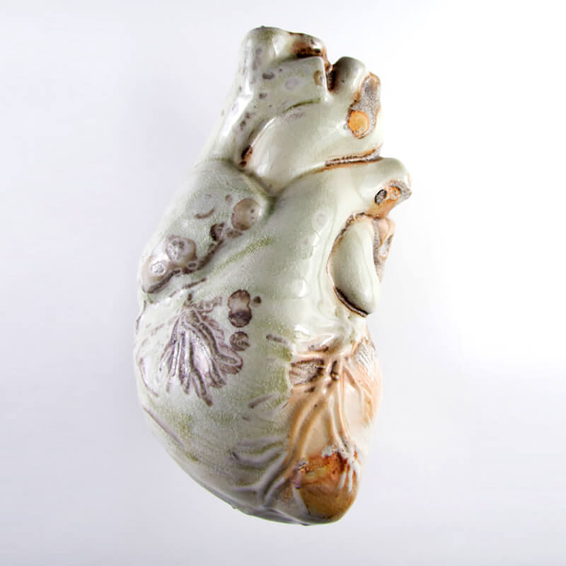 The heart is both a vital organ and a forceful image, real and symbolic, literal and figurative. It is the center of vitality, houses the soul, and encompasses the innermost emotions. The anatomical hearts that make up my work represent the anxiety and panic that consumes me. Conceptually each form demonstrates the relationship between my physiological and psychological states: converting neurotic, obsessive, intrusive thoughts, and the debilitating physical symptoms of panic attacks into a positive act of creating. I meticulously sculpt one porcelain form a day, allowing time for self-connection, a release of emotion, ritual, and a moment that is captured in time. Each form has life, a story that is burned and petrified by fire.