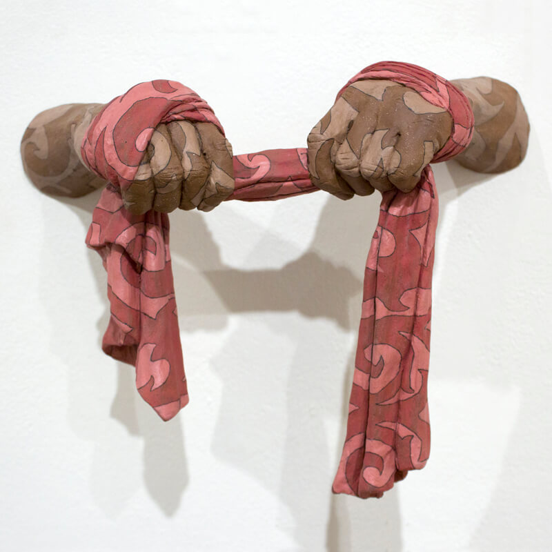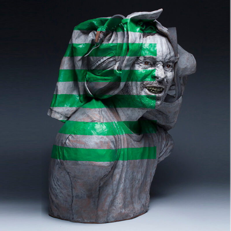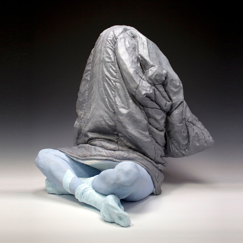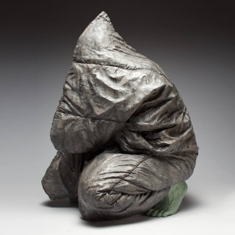 My works focus is to explore the response of the individual to the ever changing social and environmental conditions that society and life present. I use the human figure as a platform to investigate the myriad of ways in which humans react to these challenges. Rooted in the desire to master the ceramic materials potential to mimic rigid and fluid objects, I investigate the narrative possibilities presented when portraying figures interacting with common materials in unusual ways. By juxtaposing articles of clothing, and bags I attempt to assign new meaning to these materials through their interaction. There is a childlike element of play involved in these scenarios and I am fascinated by the way our relationship to the concept of “make believe” changes as we mature into adults. Adult society has a way of guiding our decisions when it comes to presenting ourselves to the world, and often times our self expression can be concealed by insecurity. I’m fascinated by this aspect of cultural assimilation through upbringing and how it raises questions of our relationship to the natural would.