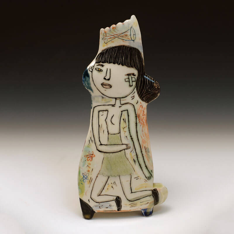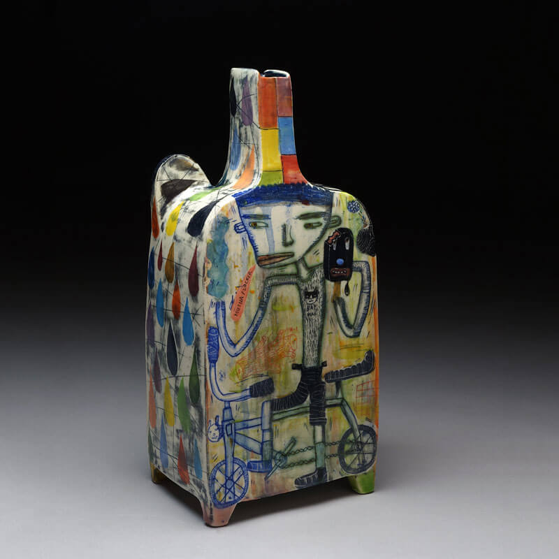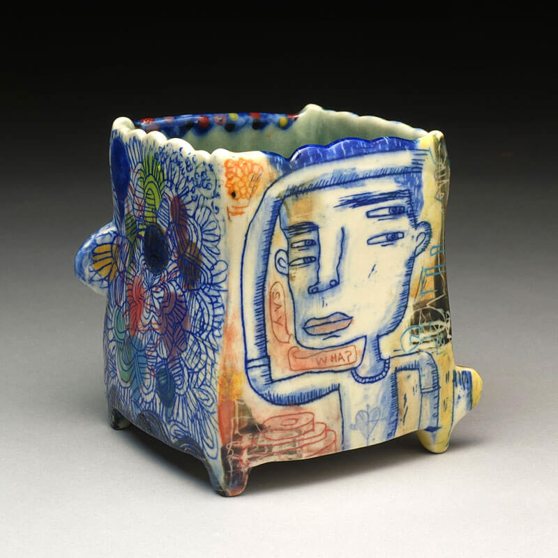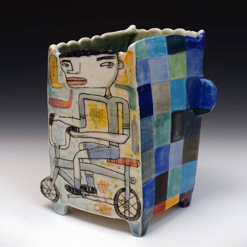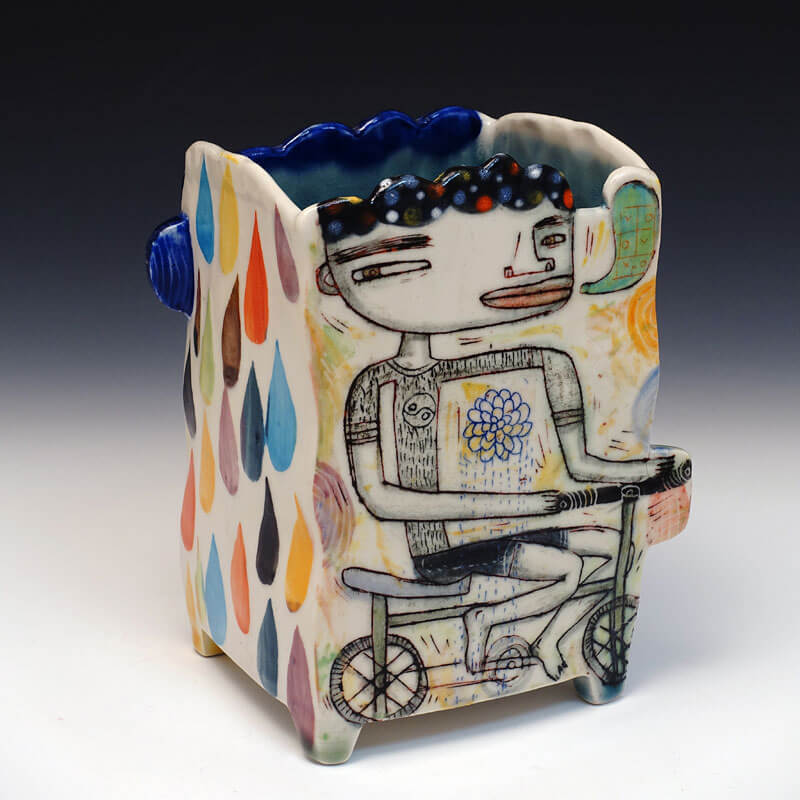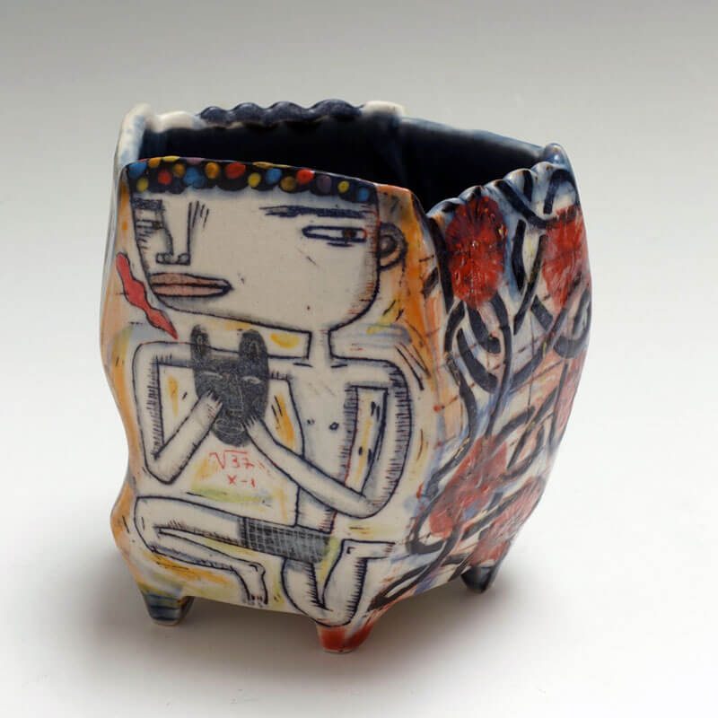 My work is based in the combination of narrative imagery on hand built ceramic forms. But primarily I think of myself as a storyteller. The stories I tell are open-ended investigations of difference and otherness. They are ways in which I can explore the underlying emotional and psychological issues of discrimination. I am interested in what happens when people who are different come together. One aspect of my work is that the narratives I portray encompass different sides, so that every side of the piece is the front side, or protagonist. This said, my approach to working with these ideas is somewhat subversive. Both the intimate scale and the jewel-like surfaces that are hallmarks of my work are a sort of misdirection that the viewer must dig through to get to the kernel of the work. I’ve loved working this way because I believe that the viewers of my work are dynamically engaged enough to understand that there is a layer of social unease below the surface. I’m very interested in pushing boundaries of my work in a direction that reveals more of unease below the surface.