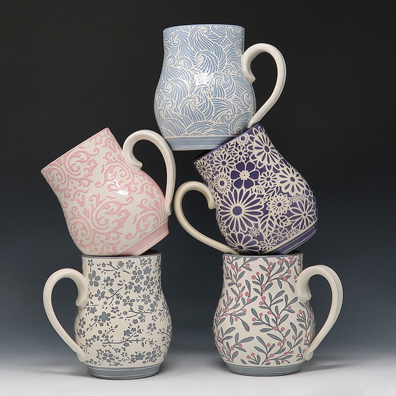 I am also attracted to the clean, precise lines of digitally created images and the endless possibilities that technology continues to offer in the realm of ceramics. Being able to explore the three-dimensional world of nature and blend it with a two-dimensional geometric surface is essential to my creativity. Utility is important to me when creating new pieces. We all have a natural understanding of function, which is why form cannot be overlooked. Perfecting the curve on a mug to fit comfortably in your hand as you enjoy your morning coffee, or designing a bowl that holds the perfect amount of bread dough, highlight the importance of utility. I take pleasure in creating forms that serve specific purposes, yet solve a need in a creative way, such as stacking canisters. Through form, clay gains focus and a sense of purpose. I design pottery that I would personally enjoy using daily and displaying in my home.