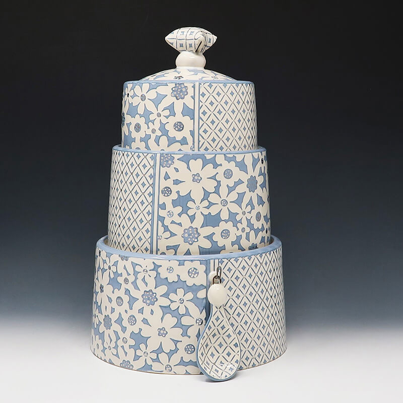 The work I create is intended to convey purpose and evoke curiosity and interest through patterns and form. I take inspiration from design elements found in everyday life, such as textiles patterns or beautifully decorated homes. I then consider how I can incorporate visual beauty into my work by adding texture, colored slips, and handmade templates to graceful forms. I view the surface of my pots as a blank canvas. My influences and inspiration largely come from the places I travel to, historic patterns, and bold patterns from decades past. Growing up on a farm in Wyoming, my childhood memories of expansive fields of flowing grain and colorful flowers in my grandmother’s gardens greatly shape my surface patterns and color palette.