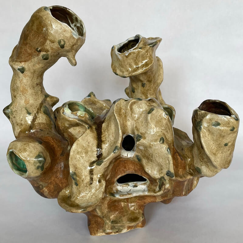 My sculptures are named for, and responding to, the natural phenomenon of Inosculation, of which the trunks, branches, roots of two trees grow together. This sensation is the aspiration of my work, to be both singular and plural, transformed and transforming in relationship to itself, to me, and viewers. Evoking layers of multiplicitous associations but not definitive categorization, I use an intuitively abstracted and fantastical visual language to think through questions of dichotomy and power. Functional and sculptural, bodily and environmental, self and other, animate and inanimate, failure and success… Inosculation is a permeable space of im/possibility, sensory tendrils reaching out always for more questions, never answers.
