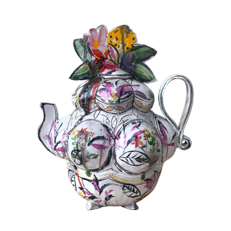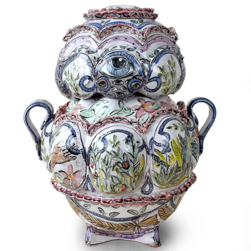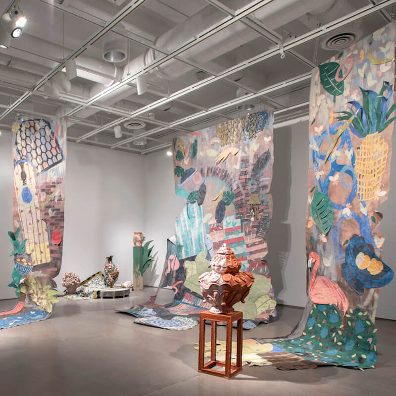 I fell in love with vessels through my introduction to the histories of ceramics in architecture and utility. I view the vessel less as an object and more as a subject; a vehicle to expressively decorate, to meditatively and gesturally ornament. Through vessels, sculpture and installation, I exaggerate the scale and material presence of domestic objects to create a heightened sense of drama and desire. While ceramics is the primary concentration of my work, I have recently expanded my focus to include painting and collage. Ceramic objects are often paired with paper murals as I find inspiration in: still life traditions, Italian fresco painting, kitsch figurines, domestic spaces, and religious and cultural narratives. I seek an expressive spontaneity in touch as I build the work and a ripe seduction in the glazed surfaces.