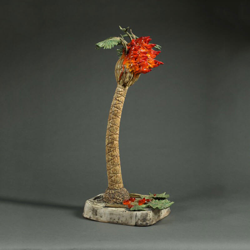 Work from the “Things on Fire” series is motivated by the challenge of sculpting ephemeral form and by the exploration of vivid color, with cartoony and stylized results. While some pieces in the series keep this visual message central, others introduce the fire and a sense of peril to more familiar objects in our environments, as these same environments literally go up in smoke.