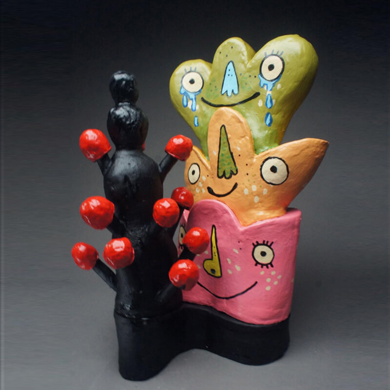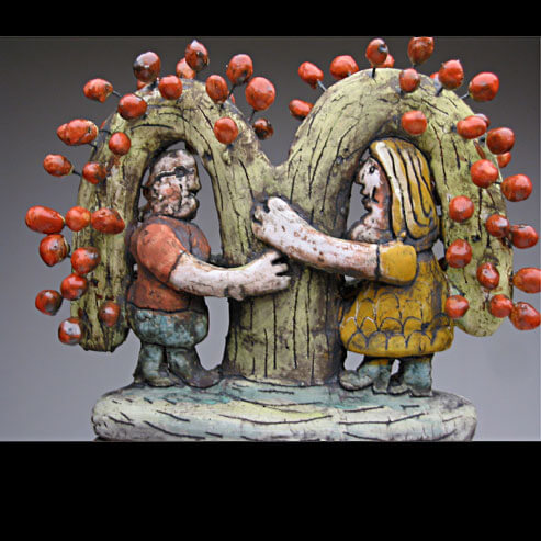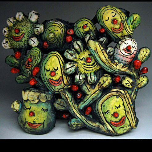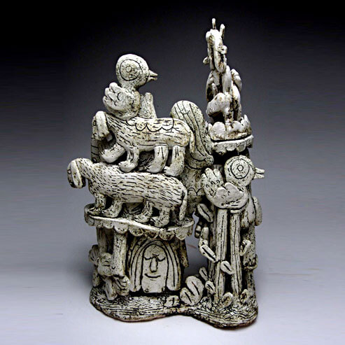 Ceramic artists can draw from a rich history of figurative art.  Examples of humor can be found in naïve art like Indian Mimbres pottery, Carolina “face jugs”, and “outsider” folk art.  Although the art’s original intent may or may not have been humor, a contemporary perspective can often find comedic value.  More contemporary examples by artists like George Ohr, Marcel Duchamp and Robert Arneson have also influenced my work.  These artists looked at the world of contemporary art from the sidelines; never being fully accepted.  They built a reputation on thumbing their noses at “the system” and create artwork that often used absurdity to get the point across. It is only now that these outsiders have become pillars of our art schools.