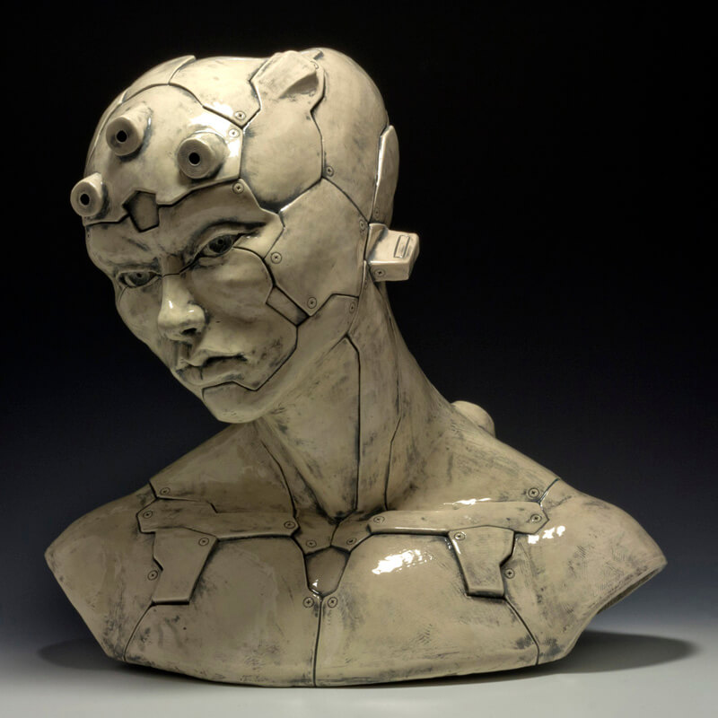 The cyberpunk classic “Ghost in the Shell” has been a huge influence in my work. This animated film brings into question what is identity through use of a constructed body. My resultant art work address the perception of the socially-constructed gender binary through the use of a cybernetic body and the idea of a fluid and contingent self. The gender theories of Donna Haraway’s Cyborg Manifesto, proposes the cyborg as a constructed being that lacks any genetic signifiers of sex or gender. She argues that the cyborg is a metaphor for a third recombinant gender. This idealized organism is neither male, nor female since it is built to represent the inner identity of the being and fully realized. As a constructed being, the biological gender is removed and is replaced with the identity of a person. Although veneered in an armored shell that exhibits some gendered characteristics, these cyborgs exhibit elements of androgyny that blur distinctions between male and female.