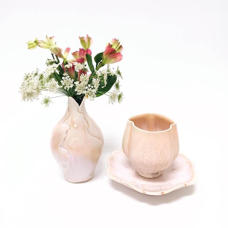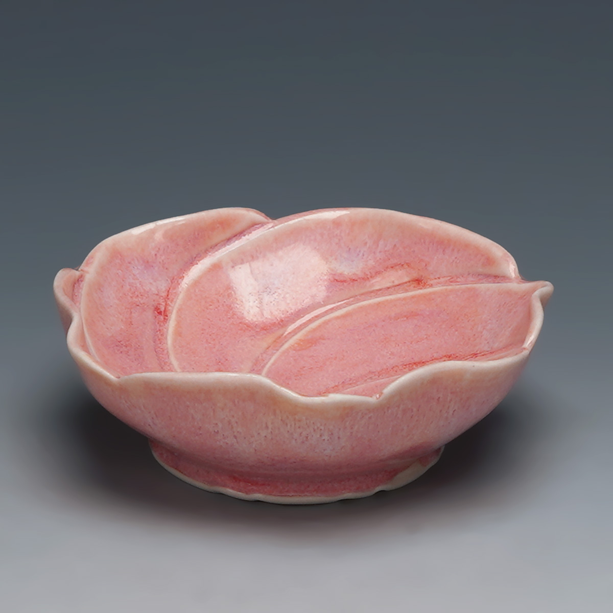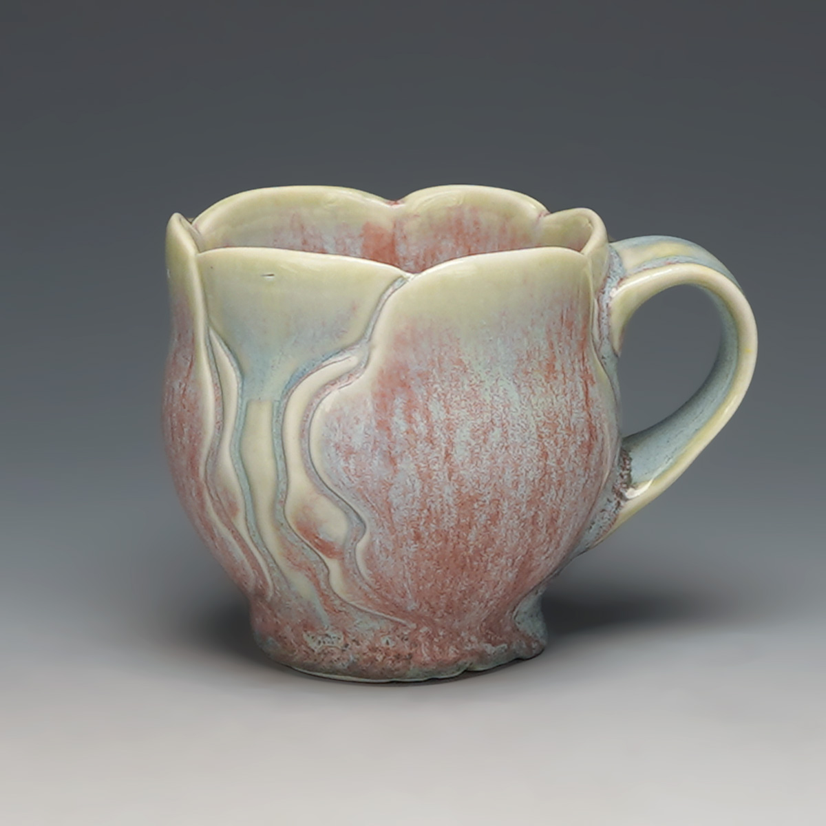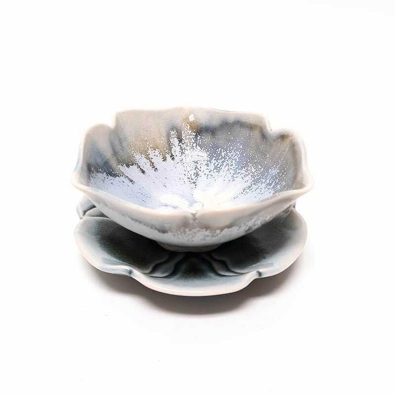 My love of plants fuels my search for beauty. I am fascinated and inspired by the physical properties of flowers including their form, surface, color, pattern, and movement. In addition, their ephemerality and sense of preciousness enhance their seemingly magical existence. My floral-inspired porcelain tableware involves hand-built and wheel-thrown components that are altered and carved. I use microcrystalline glazes to mimic the rich and captivating surfaces of flower petals. Inspired by my background in jewelry, I incorporate stone-setting techniques where I set gemstones into the raw clay. I often include these ‘hidden gems’ on the foot of a pot, rewarding the user’s investigation with a moment of discovery. To me, this act of discovery is reminiscent of noticing a dewdrop on the underside of a leaf. I want to encourage others to recognize and appreciate the small, beautiful moments that too often go unnoticed.