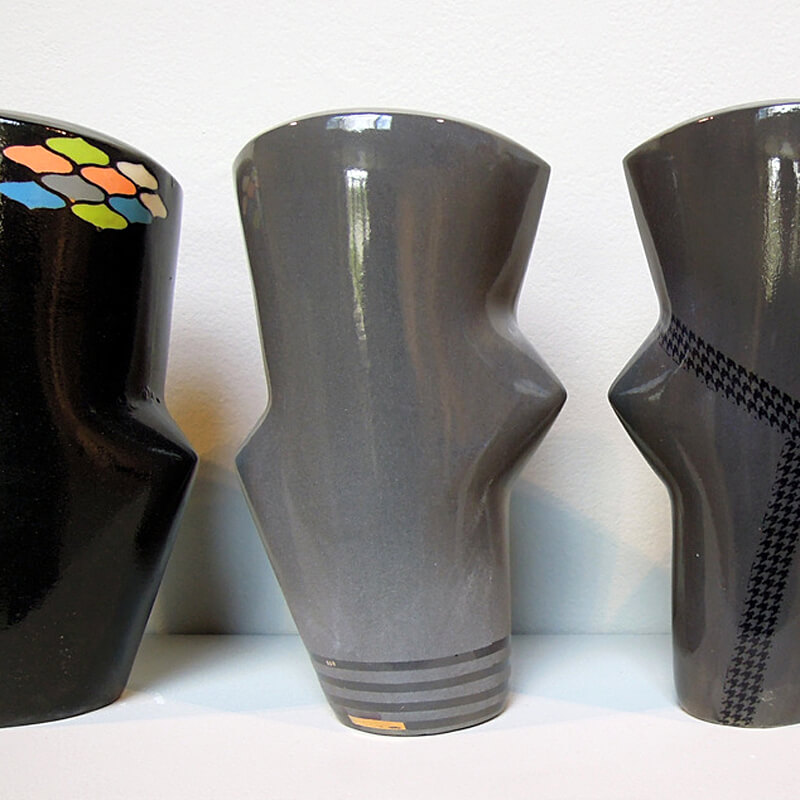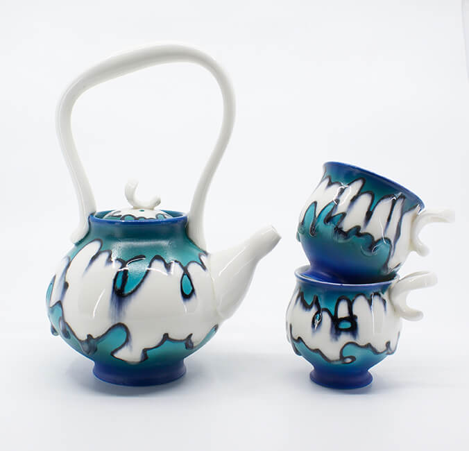 While I’m inherently drawn to precision and control in my work, I’ve come to embrace the beauty of spontaneity and serendipity. By surrendering a measure of control to the kiln, each piece takes on a life of its own, emerging as singular and with unrepeatable entities. This is evident in the dance of black graphic lines mingling with cobalt in the fluid glaze, the various color combinations, and the organic drips that emerge in the firing process.