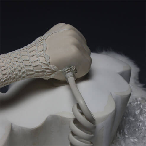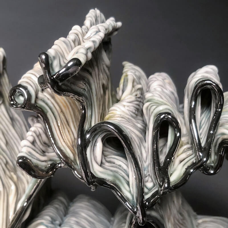 Currently, my work investigates the slippery condition of language, technology, and epistemology through sculpturally manifesting words, phrases and symbols. Utilizing an analog 3-d printing process, or manually slip trailing, I trace and obsessively retrace to build ambiguous yet personally significant terms with liquid porcelain, facilitating the evolution of virtual thought into visceral object. As in the one-ear-to-another, whispered telephone game, these works are layered, interrupted, slow journeys and surprising destinations. Perhaps a single phrase can be a dimensional map, poem, or even an entire landscape – full of nuance, power, and possibility.