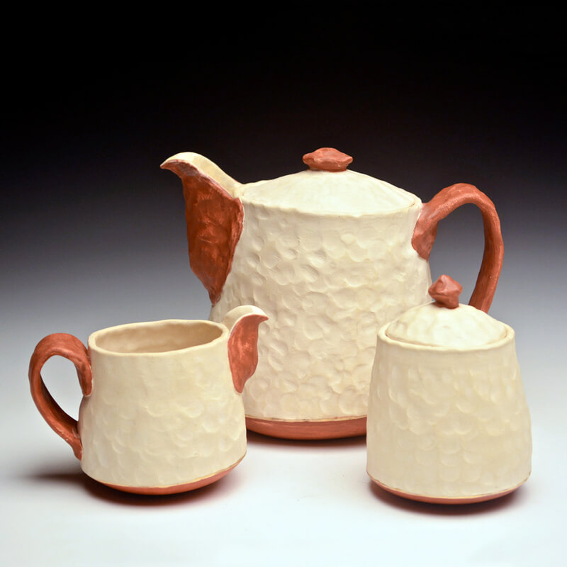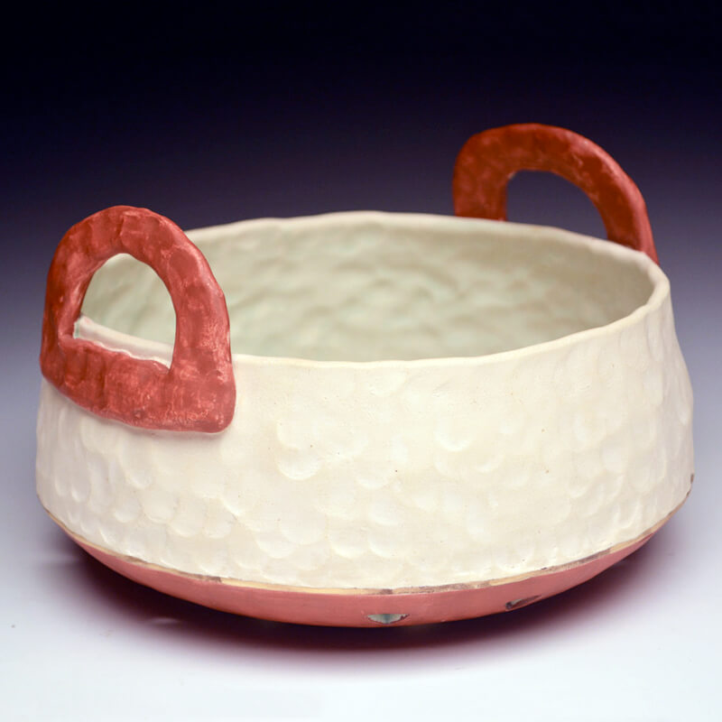 My pieces are first thrown on the wheel and then hand pinched to create texture leaving a rhythmic mark in the work. The act of pinching affects the visual pace of the piece, referencing the purposeful pace of life in the South, which I love. I make the surfaces bumpy yet very soft by using terra sigillata. Your finger tips can rest comfortably in the nooks of my pinch marks when eating a bowl of chicken and dumplings or sitting on a large porch drinking a cup of coffee. The rounded bottoms of my pieces are designed to fit the natural cup of your hand, and to create visual tension, making the user take care when placing the piece on the table. My hope is that when someone uses one of my pieces, they are met with an unpretentious moment exemplifying the mark of the maker that points to the simple, yet surprisingly soft and beautiful details that reveal themselves through use; hopefully capturing my deep love for the South.