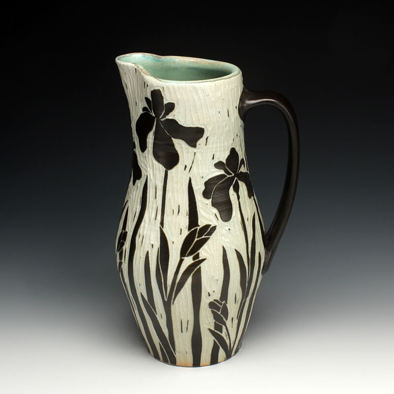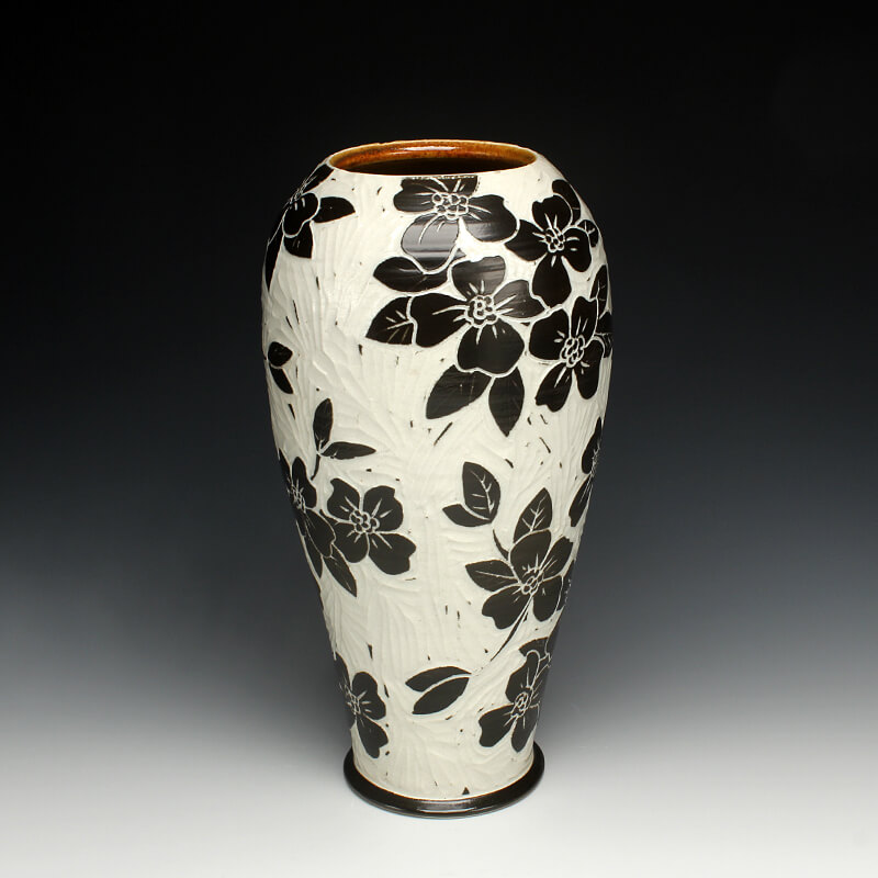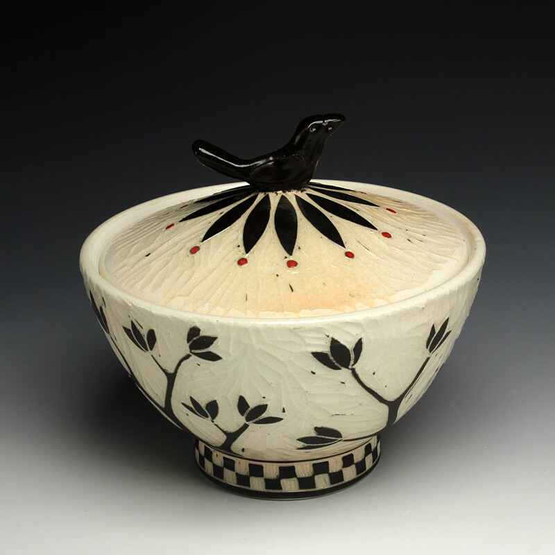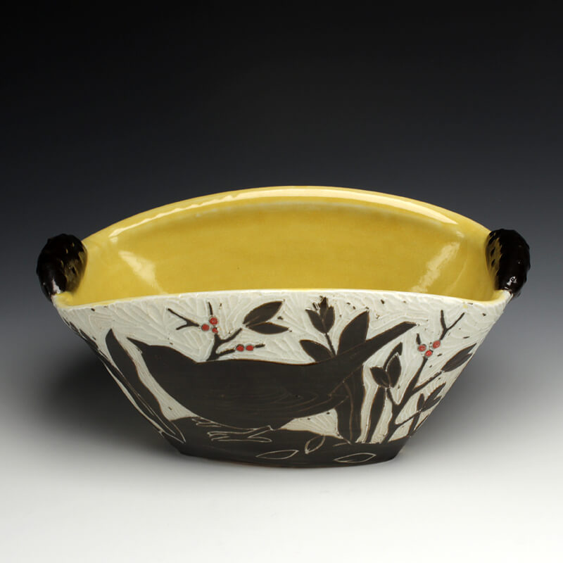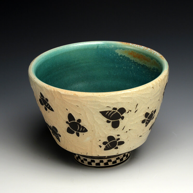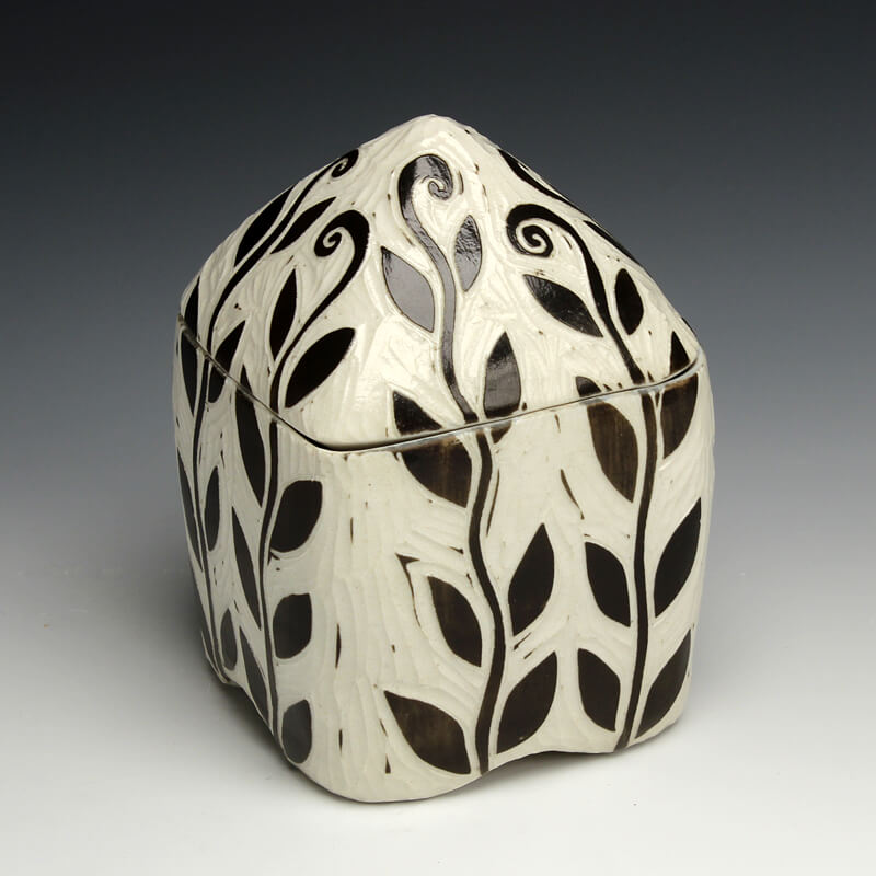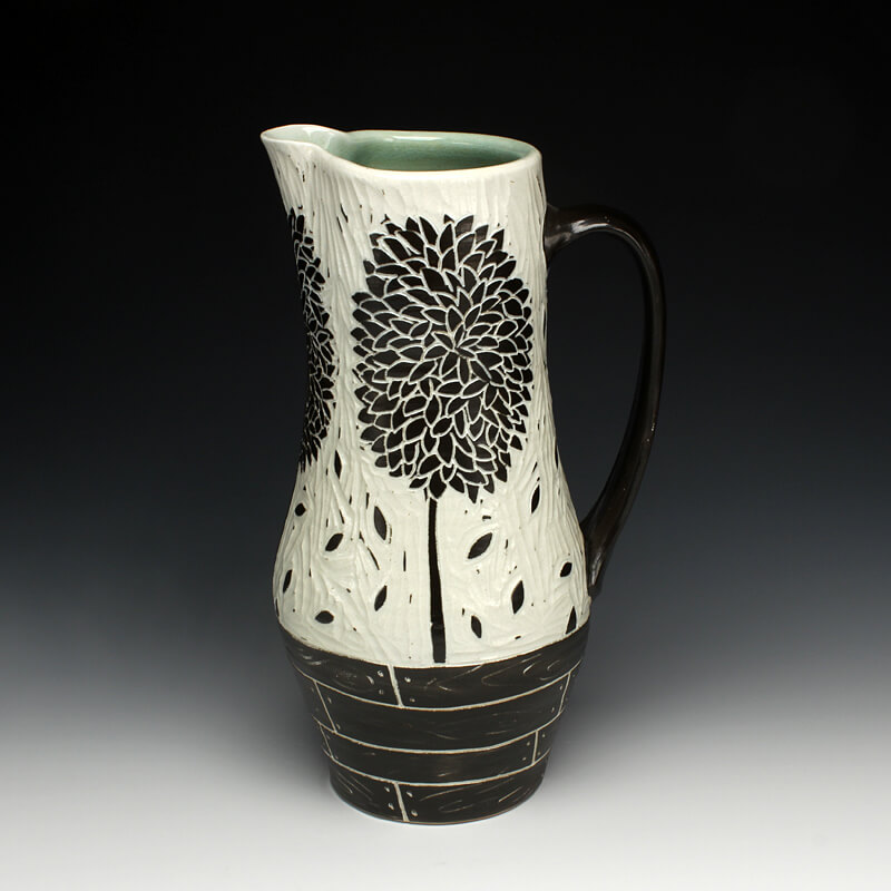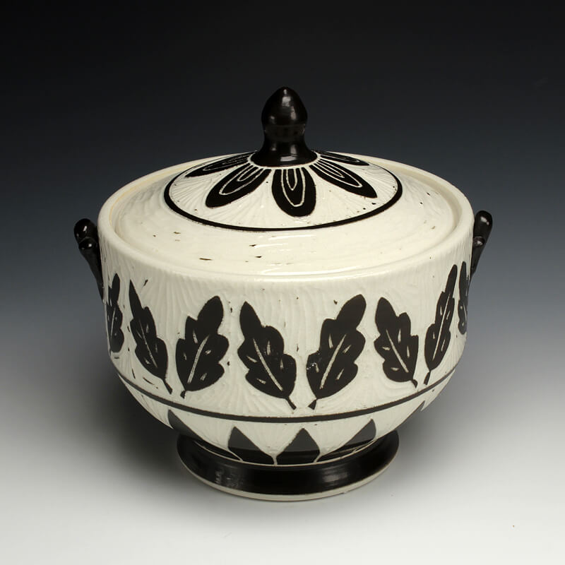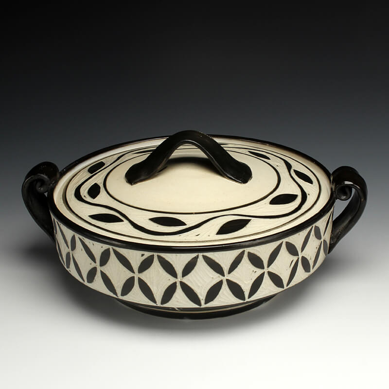 “My love of ceramic history influences the pots I make, so I strive to encompass many ceramic techniques from around the world. I use the sgrafitto carving technique which was developed in the eastern Mediterranean in the 4th century. The images on their pots represented aspects of their everyday experiences. This idea of using scenes and icons from daily life has always been an integral part of my work. I use an English porcelain clay and to complete my pots I fire them in a salt kiln, a firing method developed in Germany in the 16th century. I am also influenced by Asian, English, Islamic and French pottery from different periods. I strive to encompass many ceramic traditions from around the world and from different parts of history in the pots I make. Using the reductive sgrafitto carving method enables me to add movement to the images on the surface of my pots. To further amplify this notion of lively animation I use the salt glaze firing method to activate the surface of my pots. This firing style promotes subtle color variations in the clay and applied glazes while also glazing the carved areas of my pots. The fire completes my process making each piece distinctive.”